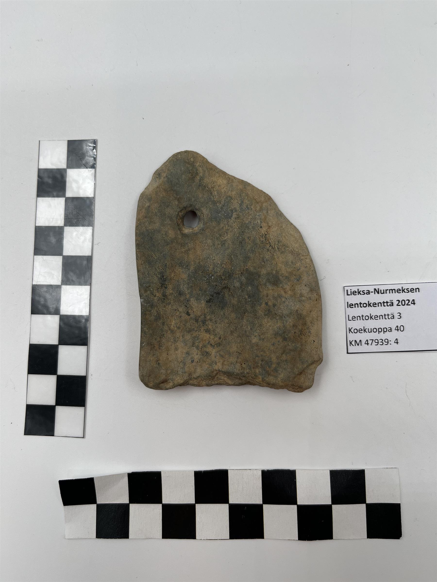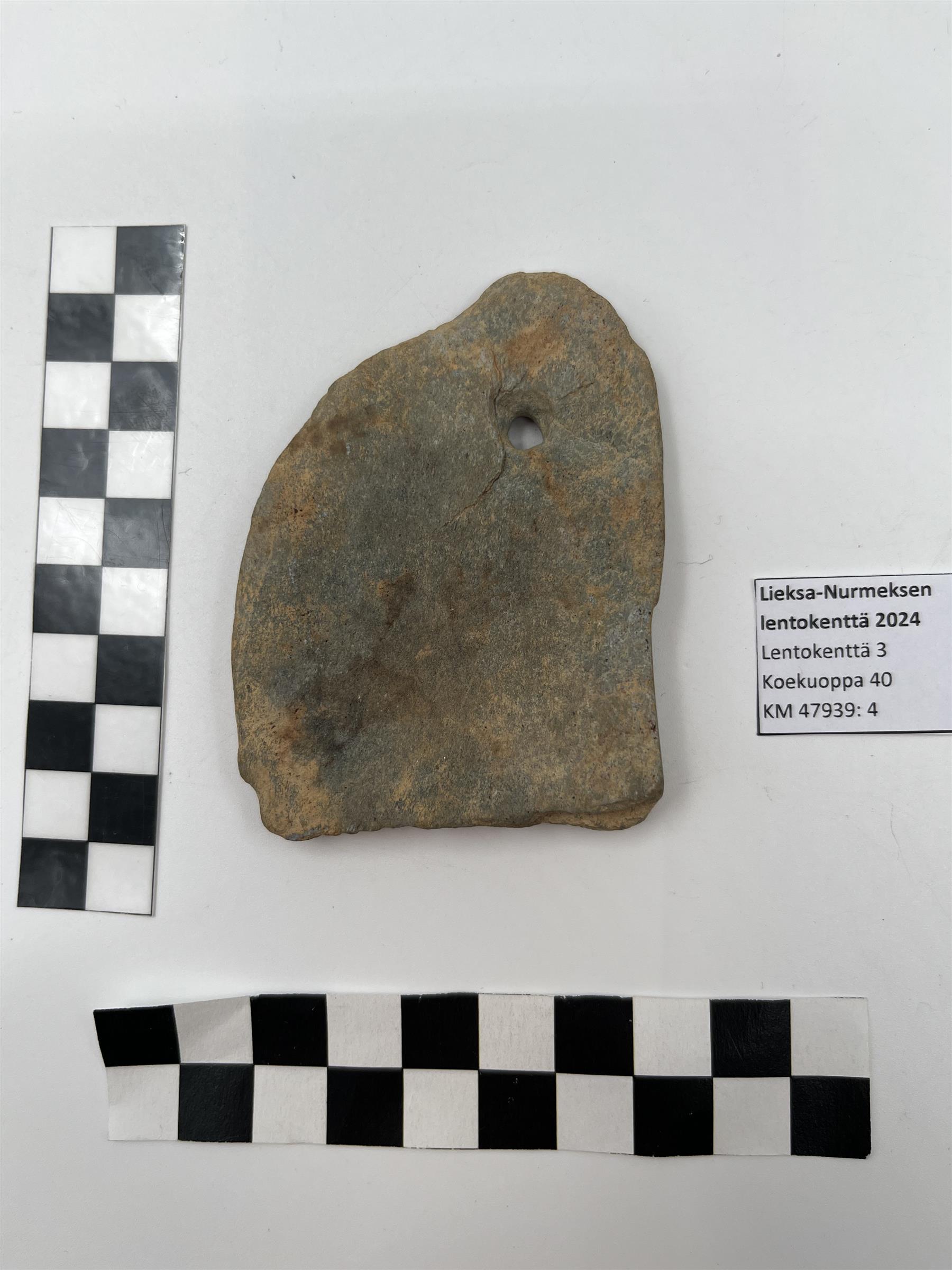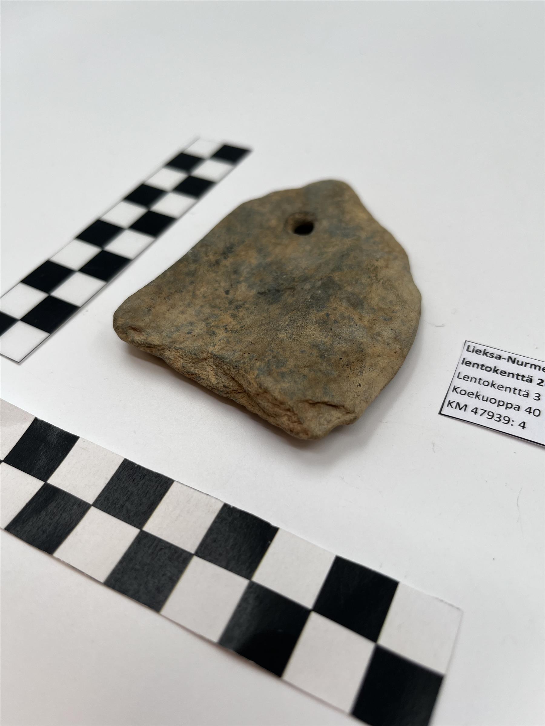 | Koekuopasta 40 poimittu reiällinen liuskekivinen hioin. Väriltään vihertävää kiveä. Toiselta lappeeltaan hiotumpi kuin toiselta. Lisäksi toisella lappeella 29 mm leveä uurre, joka noin 4 mm syvä. Uurteen kummallakin puolella harjanteet, joissa näkyi esinettä puhdistettaessa hionnan jälkiä. Esineen toinen pää näyttää lohjenneelta. Reiän halkaisija 7 mm. Reikä kaiverrettu kummankin lappeen puolelta. | |