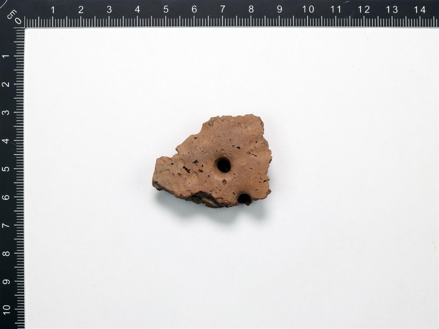 | Kampaleimalla ja kuopilla koristeltu pala. Savimassa on harmaanruskea ja sekoitteena on käytetty orgaanista ainetta ja hiekkaa. | |