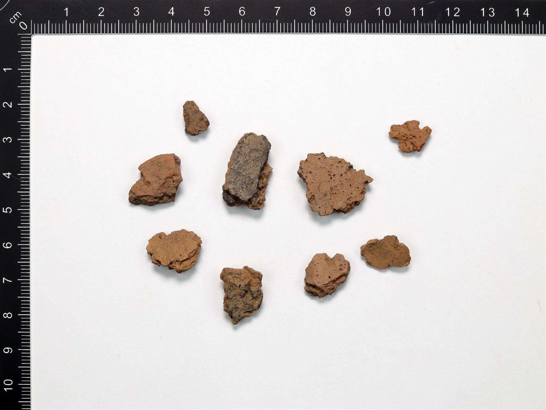 | Lohjenneita paloja ilman koristelua. Savimassa on harmaanruskea ja sekoitteena on käytetty orgaanista ainetta ja hiekkaa. | |