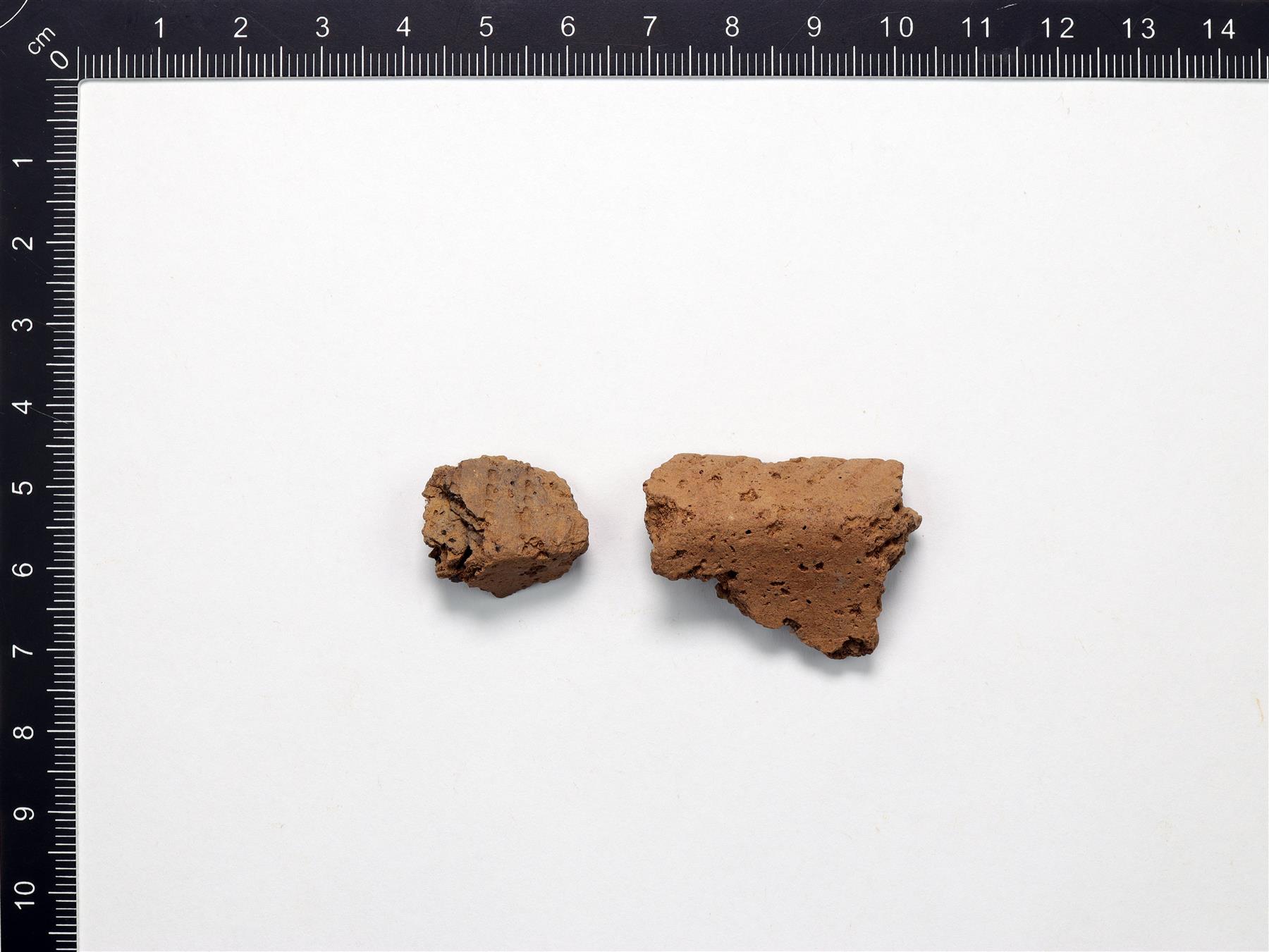 | Astian lohjenneita reunapaloja. Palojen reuna on tasapintainen ja sen päällä on viistoja kampaleimoja. Savimassa on harmaanruskea ja sekoitteena on käytetty orgaanista ainetta ja vähäinen määrä hiekkaa. | |