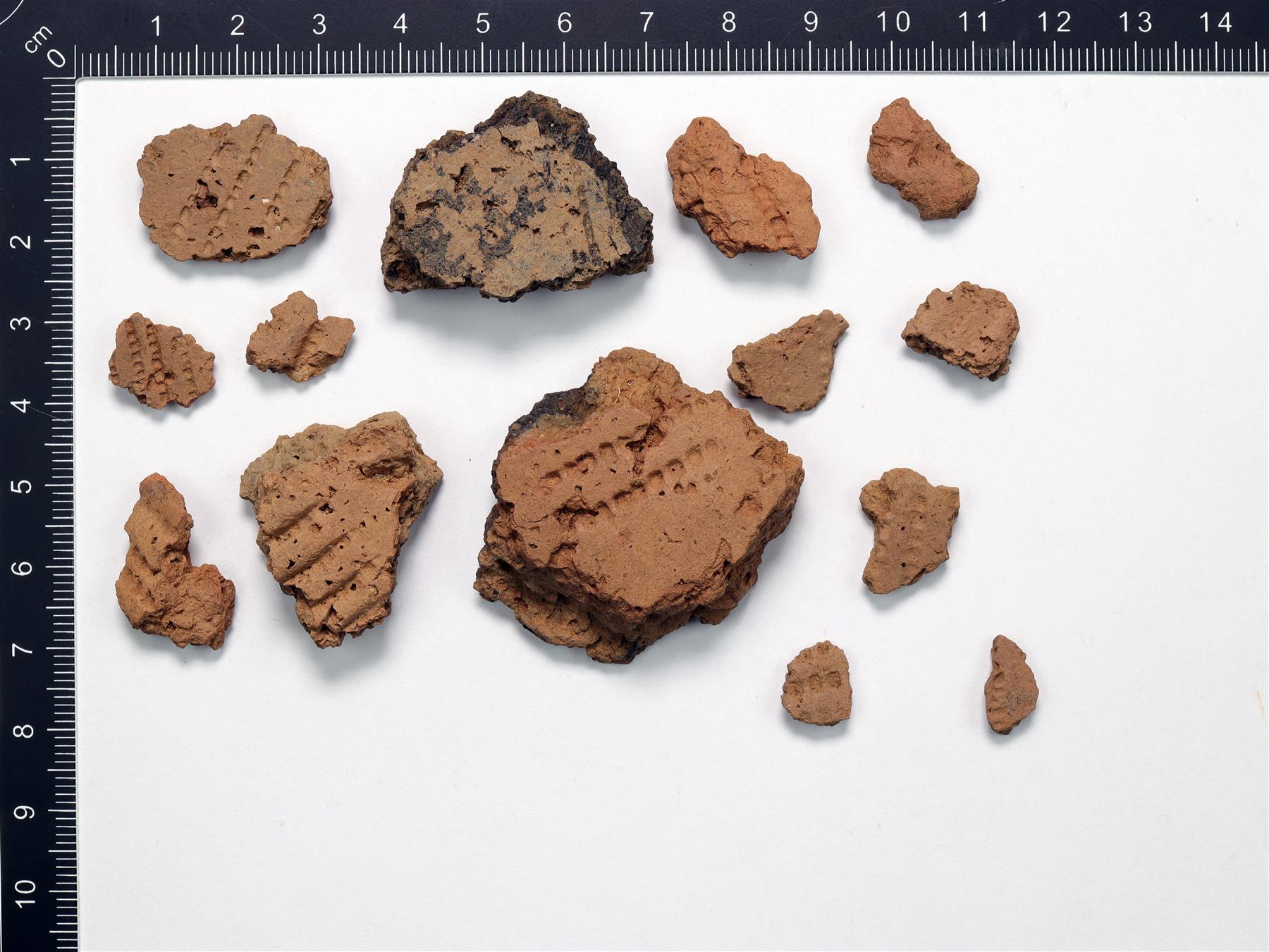 | Kampaleimalla koristeltuja paloja. Savimassa on harmaanruskea ja sekoitteena on käytetty orgaanista ainetta ja hiekkaa. | |