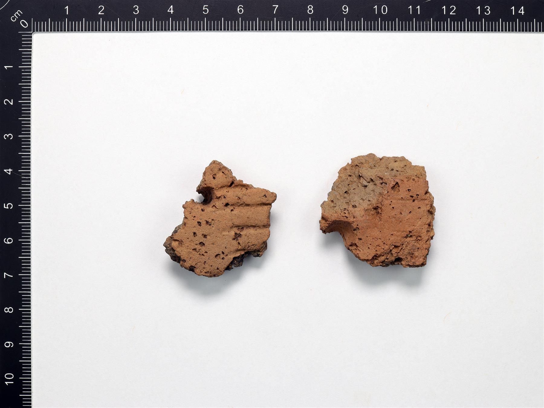 | Kampaleimalla ja kuopilla koristeltuja paloja. Savimassa on harmaanruskea ja sekoitteena on käytetty orgaanista ainetta ja hiekkaa. | |