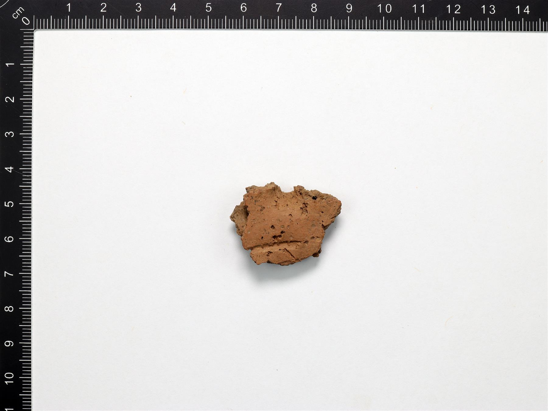 | Kuoppa- ja kampaleimakoristeltu pala, joka on lohjennut. Savimassa on harmaanruskea ja sekoitteena on käytetty orgaanista ainetta ja hiekkaa. | |