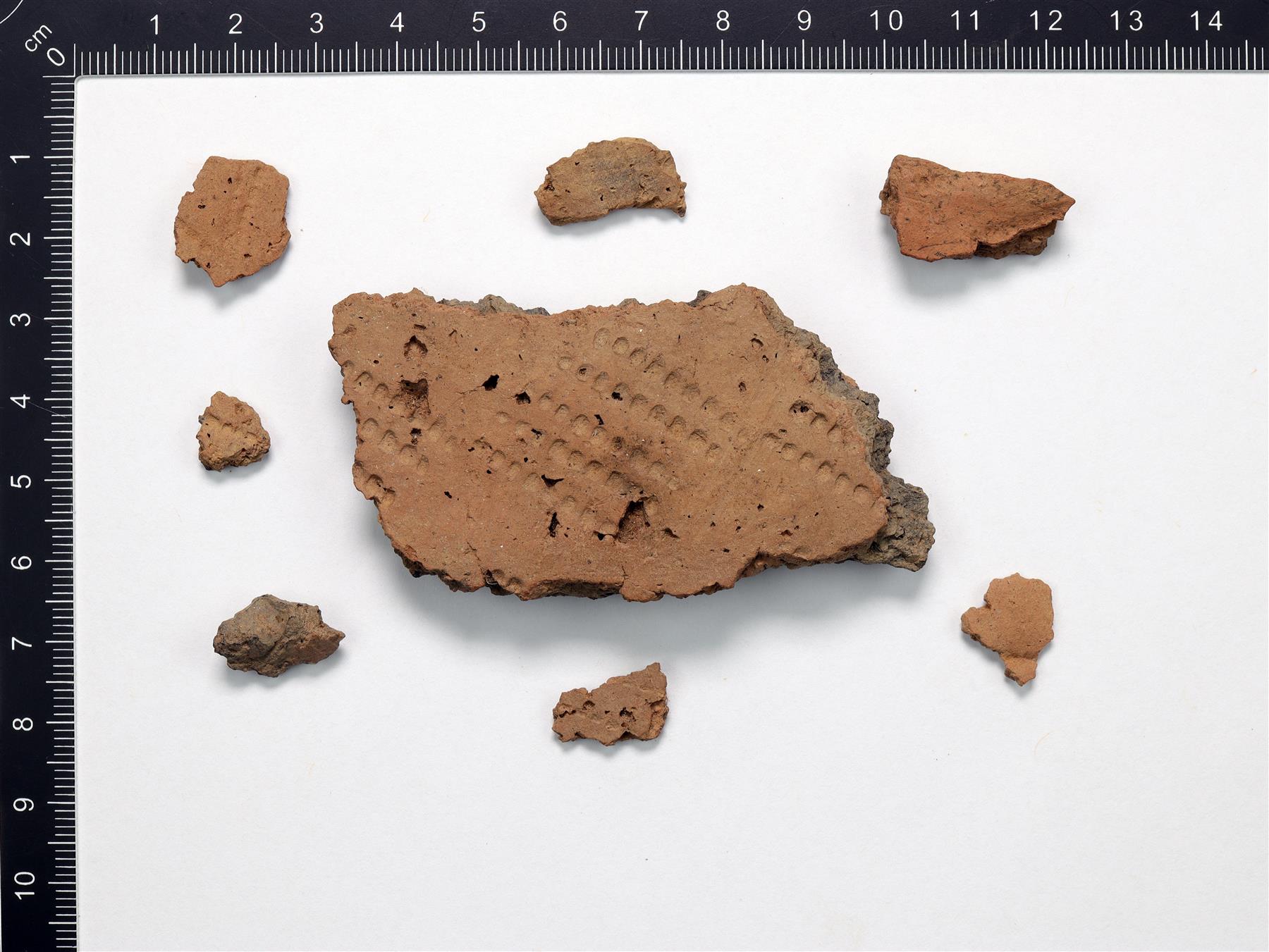 | Kampaleimakoristeltuja paloja, josta valtaosa ovat lohjenneita. Savimassa on harmaanruskea ja sekoitteena on käytetty orgaanista ainetta ja hiekkaa. | |