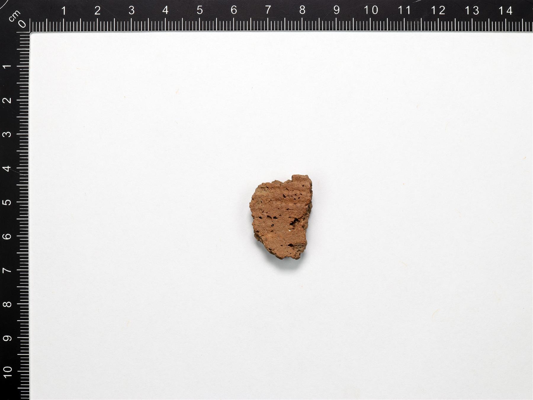 | Lohjennut pala, joka on koristeltu kampaleimalla. Savimassa on harmaanruskea ja sekoitteena on käytetty orgaanista ainetta ja hiekkaa. | |