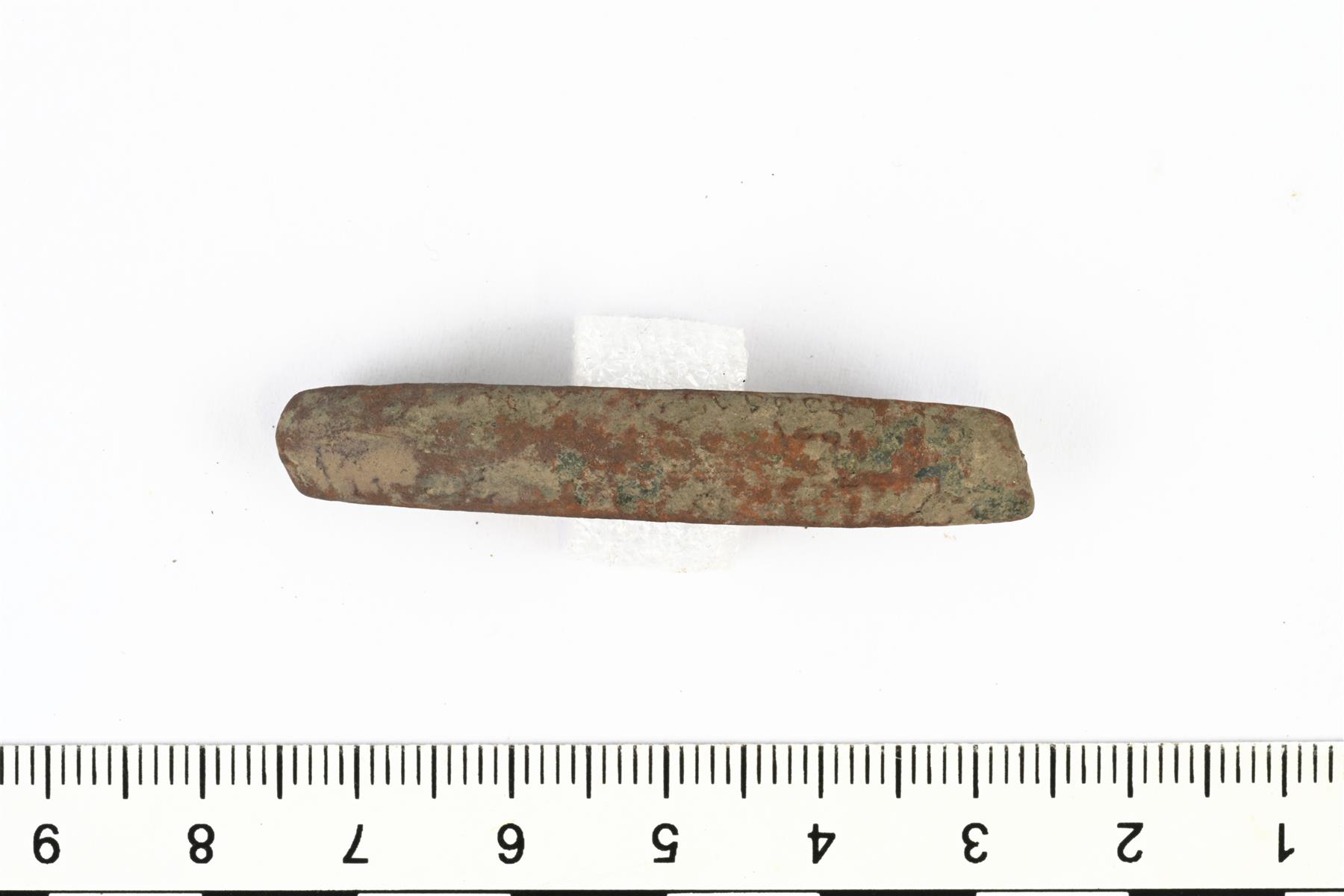 | Poikkileikkaukseltaan kolmiomaisen rannerenkaan katkelma. Pinta on hyvin kulunut, mutta päädyssä erottuu hentoja jäänteitä poikittaisista viivauurteista. Lisäksi muusta koristelusta erottuu pisteleimoja. Vrt. Moora XXII: 3. | |