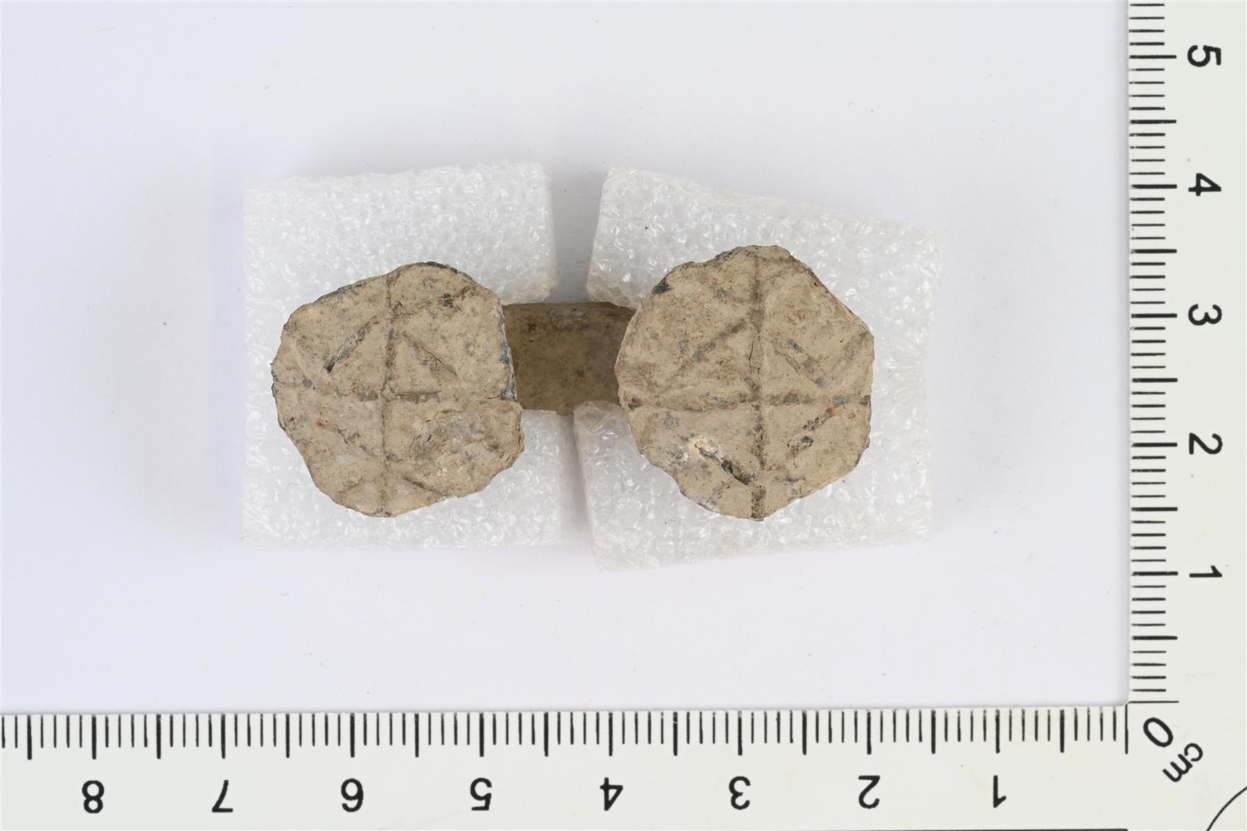 | Kaksoisnappi. Tina- tai lyijyseosta. Nappien etupuolella reliefikoristeluna viivakuvio, jossa risti ja vinoneliö. | |
