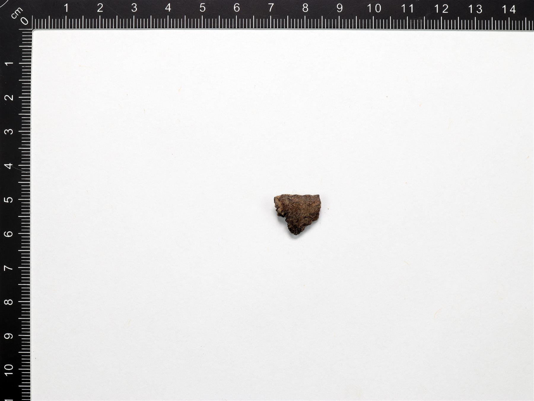 | Lohjennut reunapala ilman koristelua. Harmaanruskea savimassa. Sekoitteena orgaanista ainetta ja hiekkaa. Palassa on hiiltynyttä pintakarstaa. | |