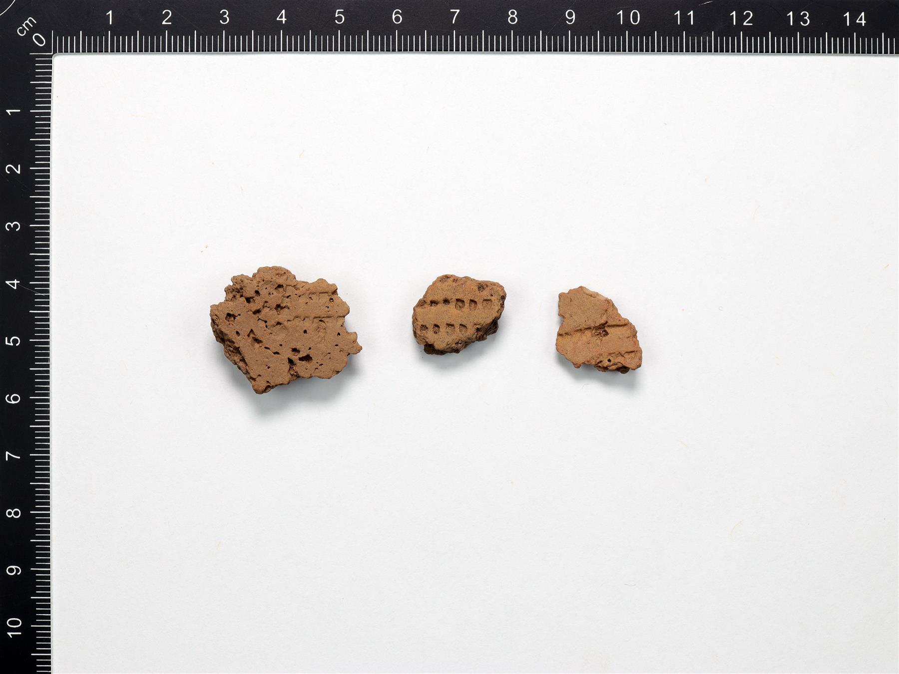 | Lohjenneita paloja, joissa on kampaleimakoristelua. Harmaanruskea savimassa. Sekoitteena orgaanista ainetta ja hiekkaa. | |