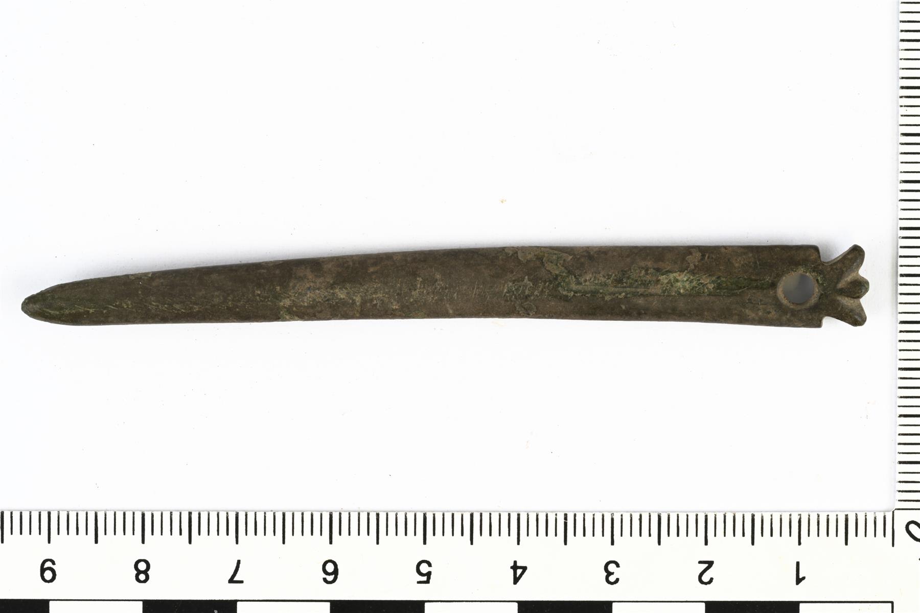 | Kruunupäinen neula. Yläosassa on reikä. | |