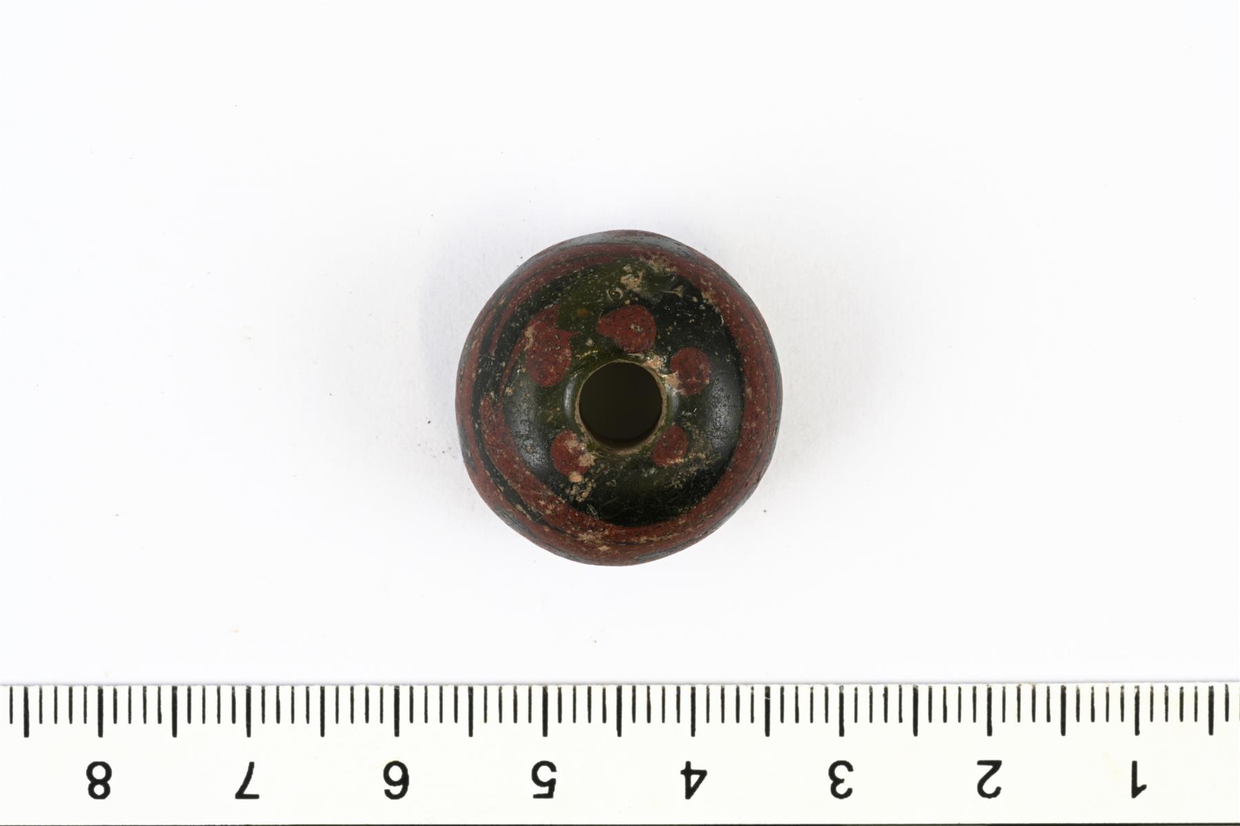 | Pallomainen ja tummanvihreä lasihelmi. Koristeluna punaruskeita pisteitä, viiva ja aaltokuvio. Läpikuultava ja sispuolella erottuu ilmakuplia. | |