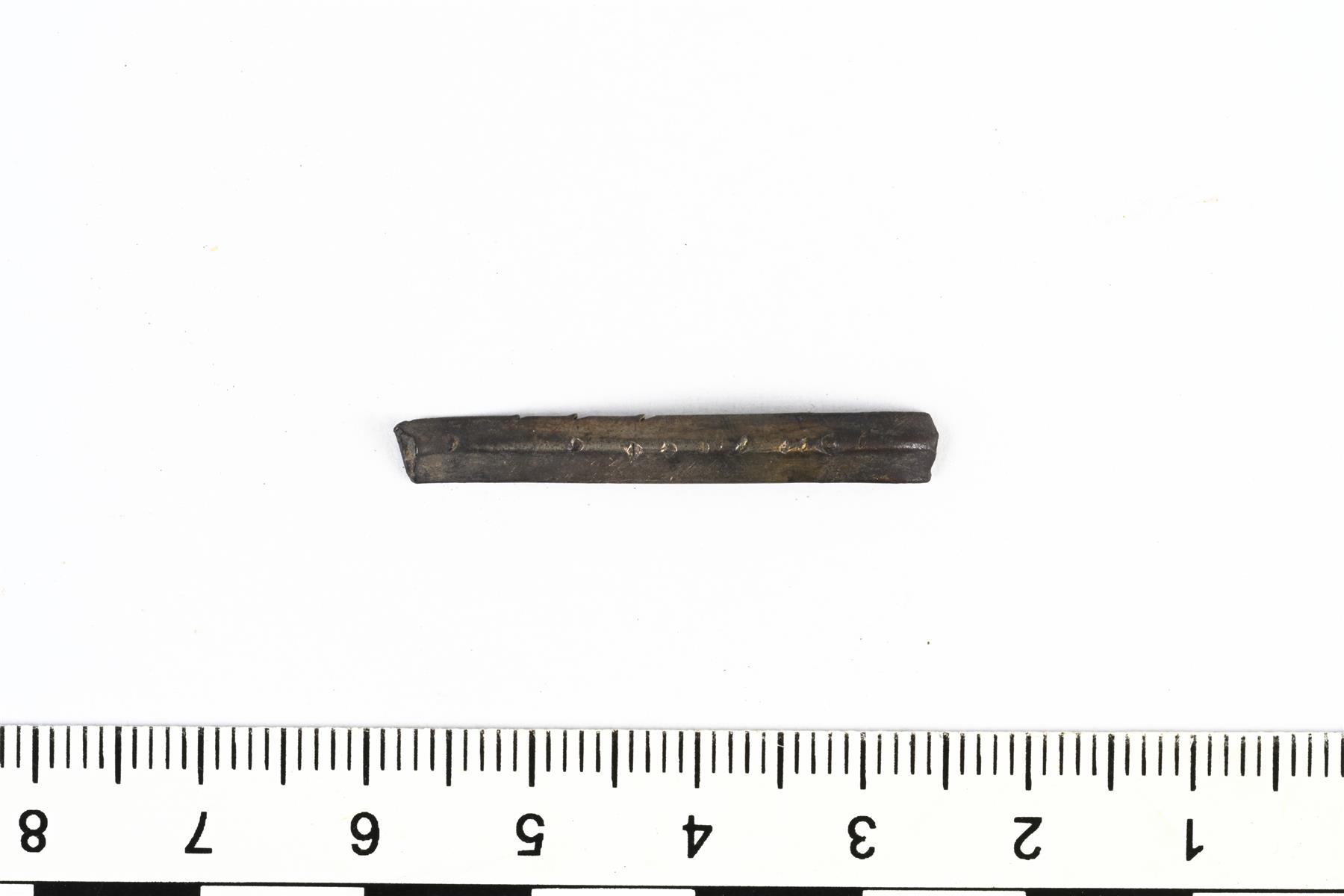 | Poikkileikkaukseltaan kolmiomaisen hopeavartaan katkelma. Sormuksen tai maksuhopean pala. | |