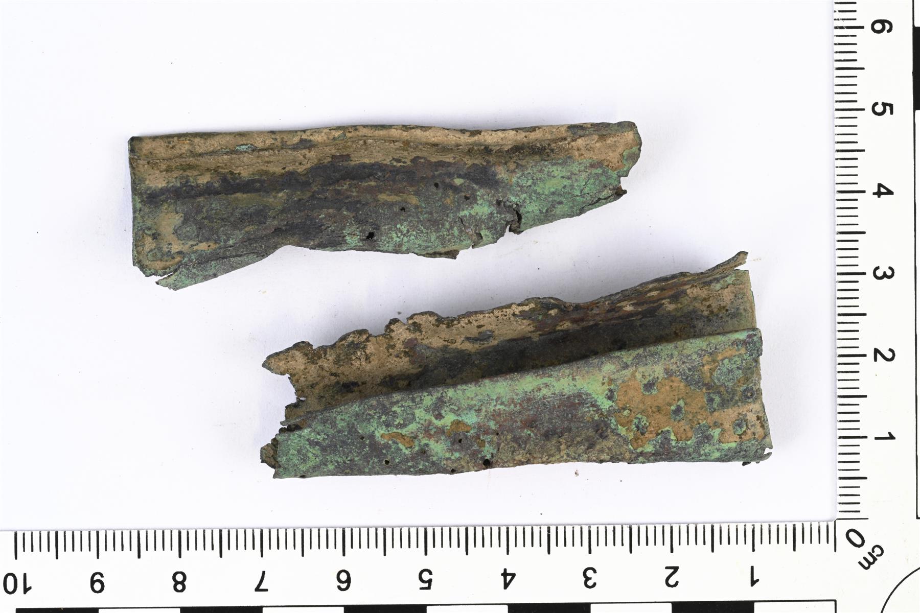 | Kuparipellin katkelmia. Yksi reuna on taitettu. Mahdollisesti astiasta. | |