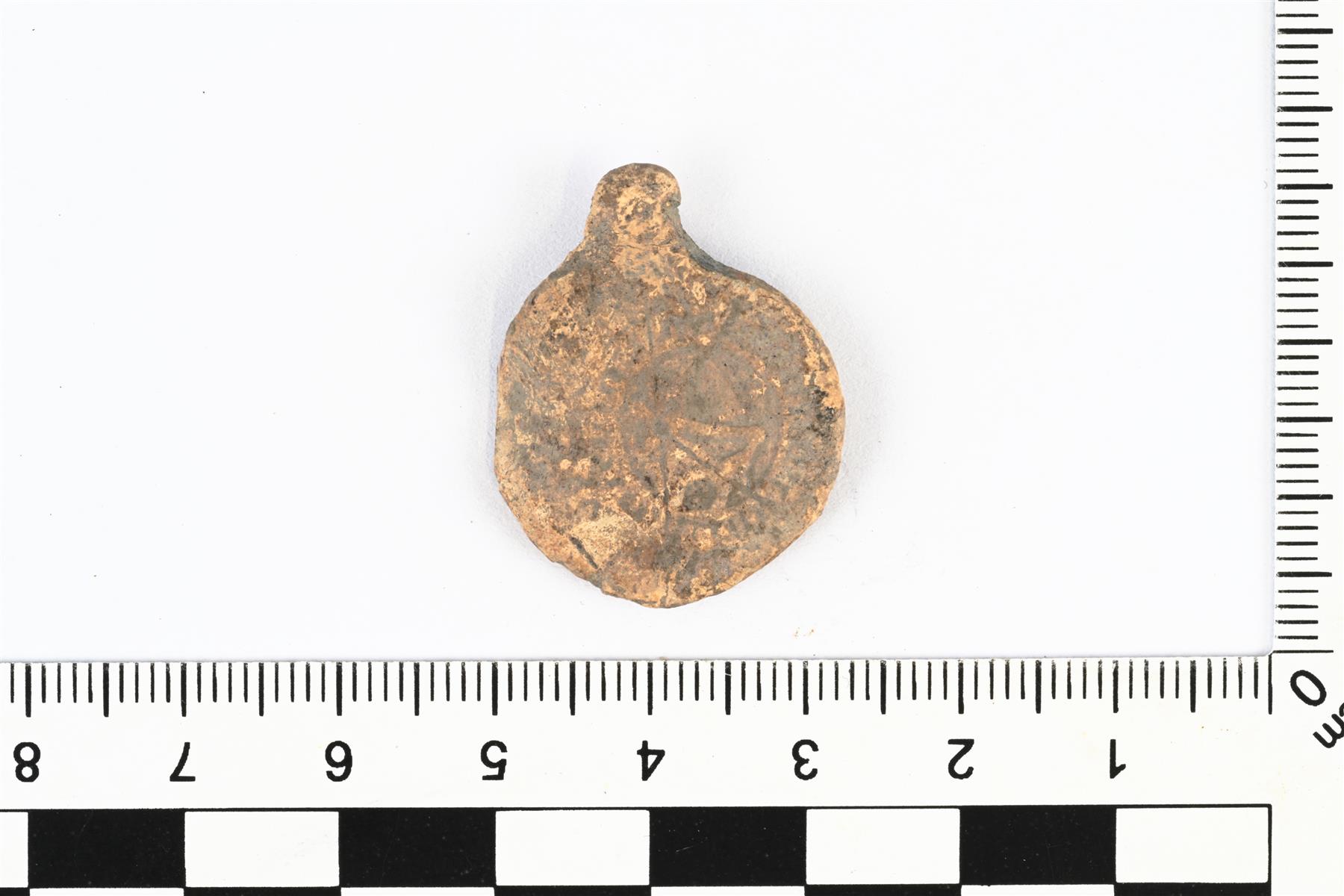 | Pyöreä lyijyplombi. Pinta on melko kulunut. | |