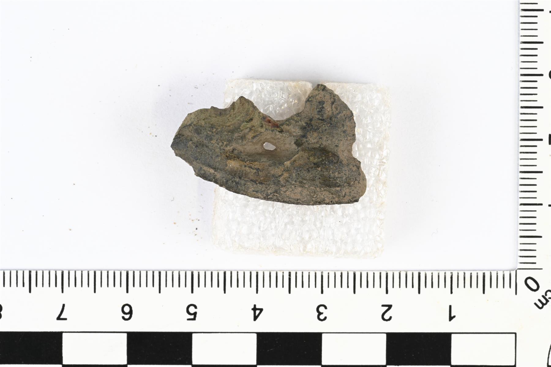 | C-tyypin pyöreän kupurasoljen reunakatkelma. Koristeluna reikäkuvioita ja nauhakäärmeitä. Reunassa on myös hyvin pelkistetyksi kohoumaksi muuttunut eläimen pää. Taustapuolella on neulan kiinnityslenkin jäänne. | |
