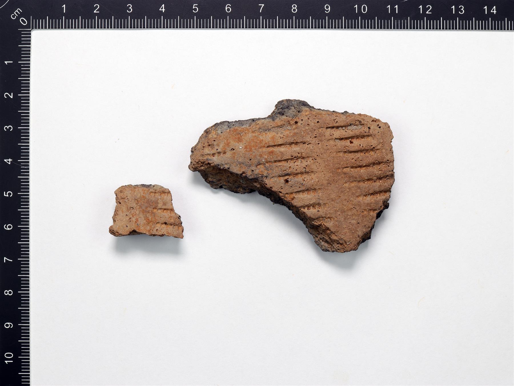| Kampaleimakoristeltuja paloja. Harmaanruskea savimassa. Sisäpinnat ovat tummentuneet. Sekoitteena orgaanista ainetta ja hiekkaa. | |