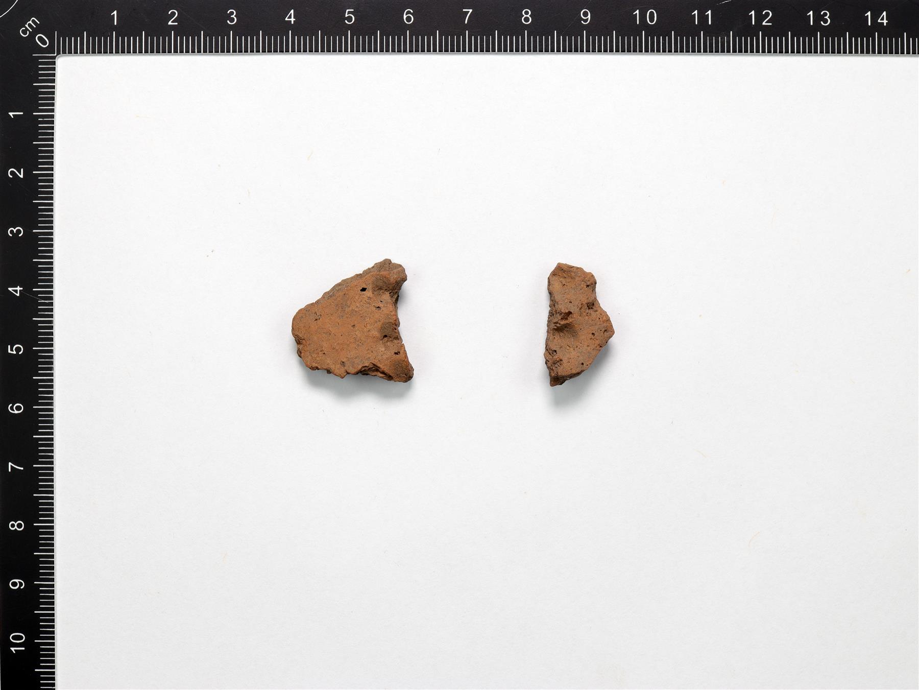 | Pyöreähköillä painanteilla koristeltuja paloja. Molemmat palat ovat lohjenneet. Harmaanruskea savimassa. Sekoitteena orgaanista ainetta. | |