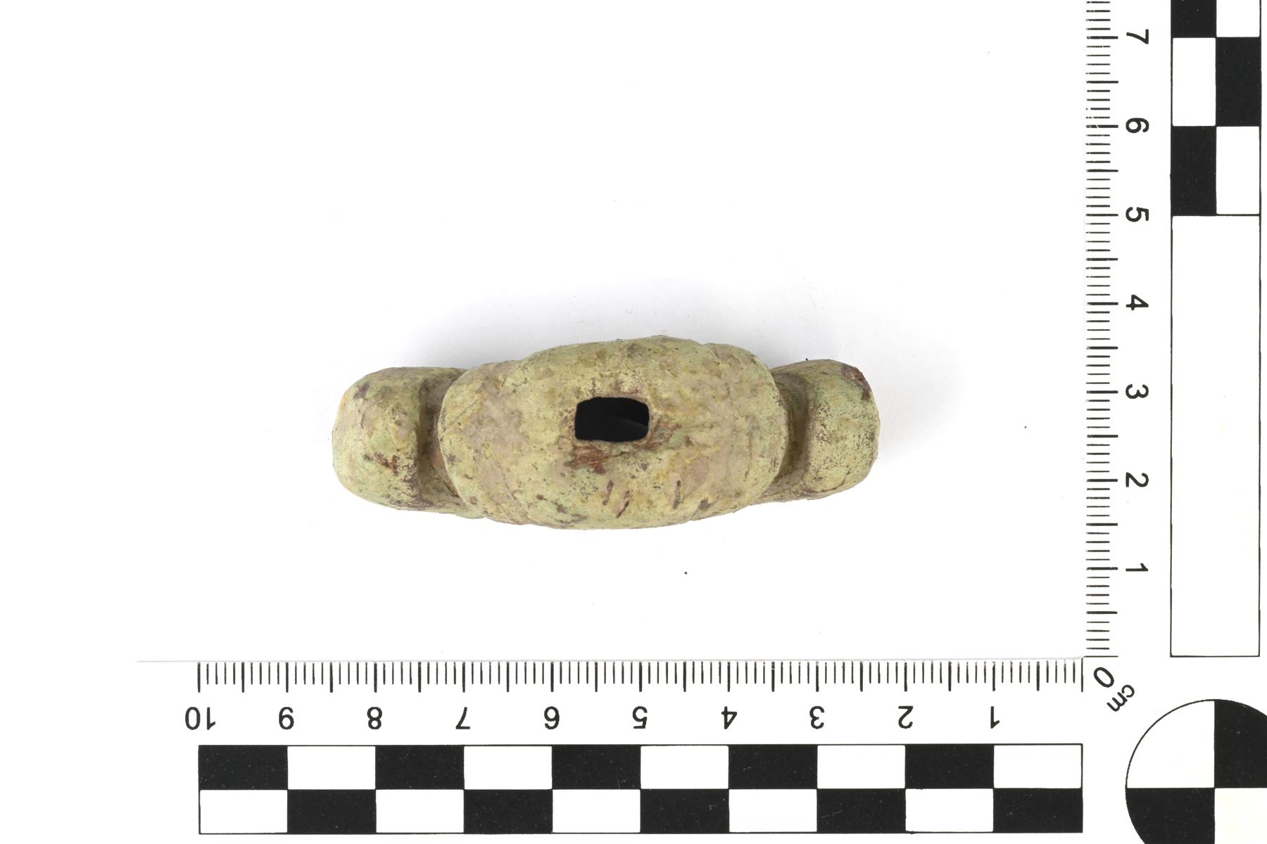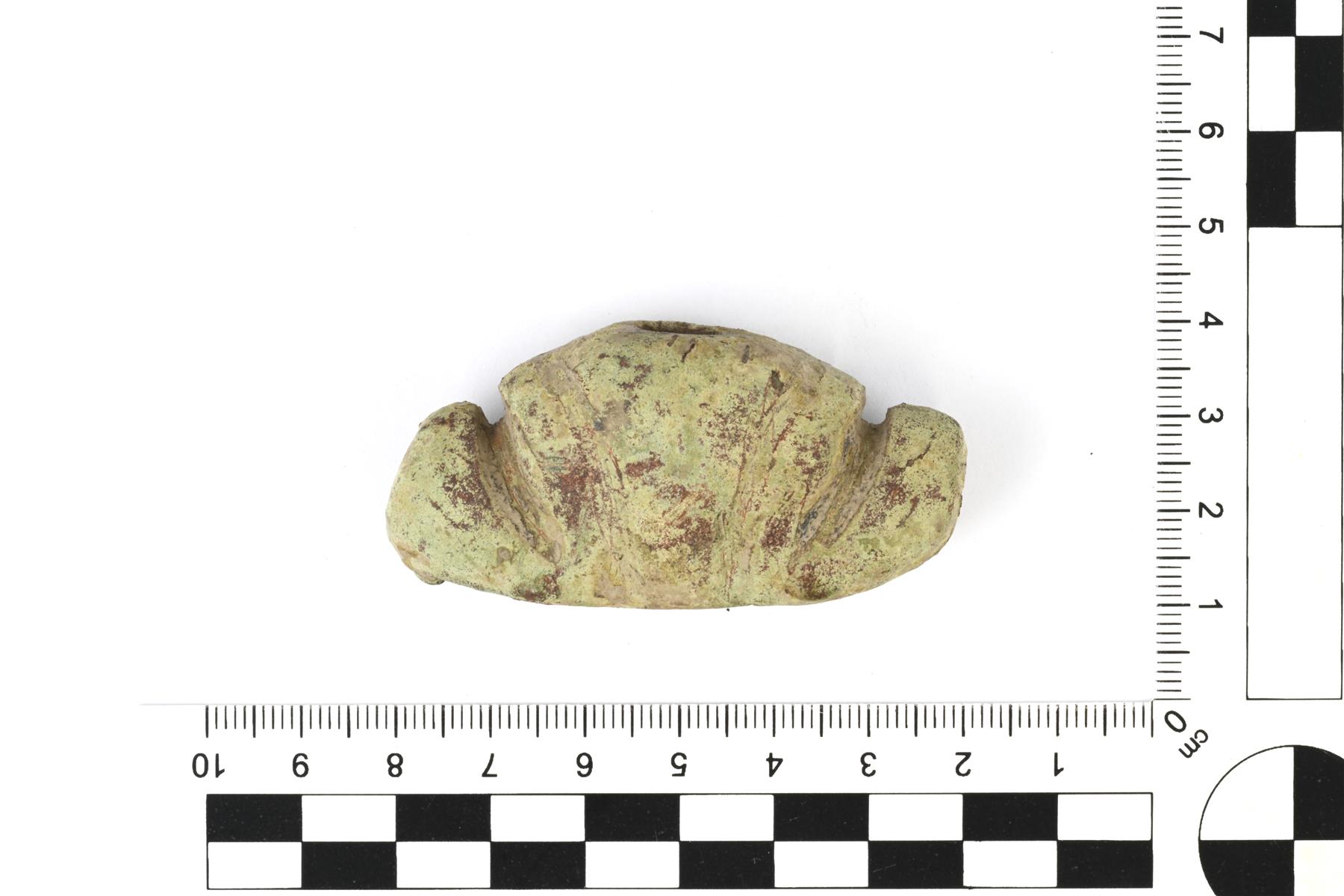 | Viikinkiajan kupariseoksinen miekanponsi, hyvin harvinainen, muistuttaa R-tyyppiä. Keskilohkon laella reikä. Samantapainen sisältyy Statens historiska museetin kokoelmiin (Gotlanti, Stora Sojdeby, förvärvsnummer 34300, föremålsnummer 457865_HST). | |