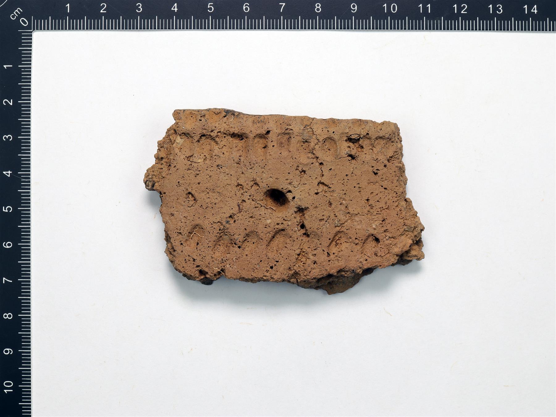 | Kuopilla ja soikeilla painanteilla koristeltu reunapala. Reuna on suora ja sen päällä on soikeita koristepainanteita. Harmaanruskea savimassa. Sekoitteena orgaanista ainetta ja hiekkaa. Sisäpinnalla on hiiltynyttä karstaa. | |