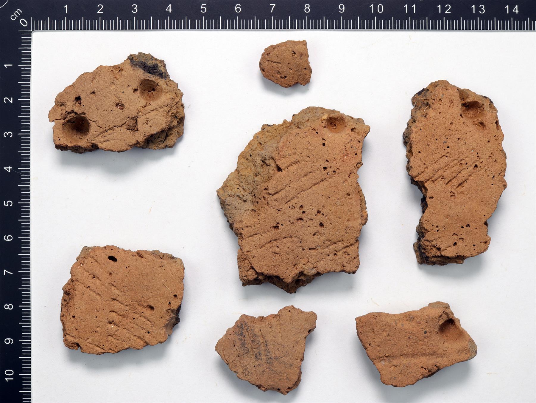 | Kuoppa- ja kampaleimakoristeltuja paloja. Harmaanruskea savimassa. Sekoitteena orgaanista ainetta ja hiekkaa. Useassa palassa on hiiltynyttä karstaa sisäpinnalla. | |