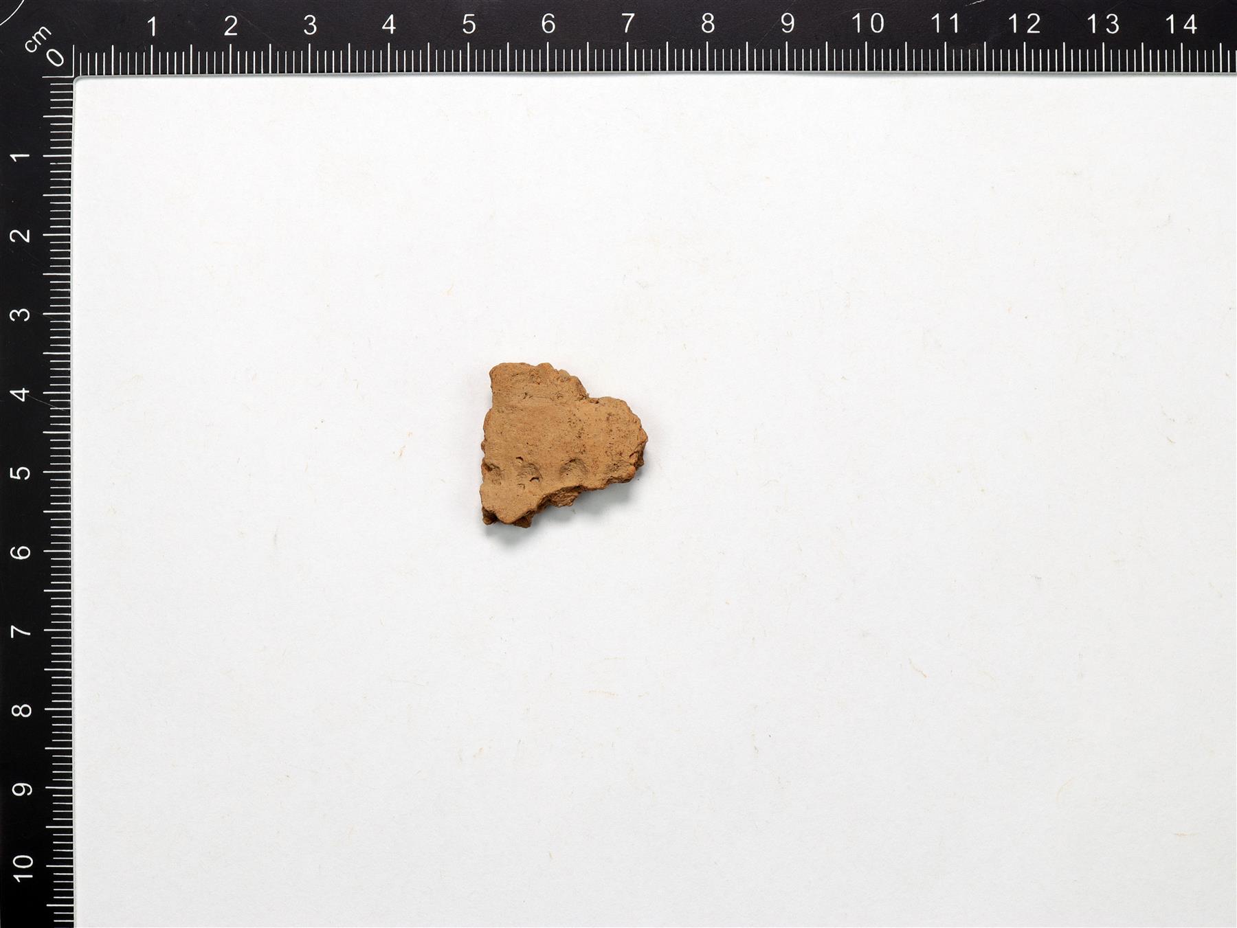 | Lohjennut pala, joka on koristeltu pienillä pyöreillä painanteilla. Harmaanruskea savimassa. Sekoitteena hiekkaa. | |