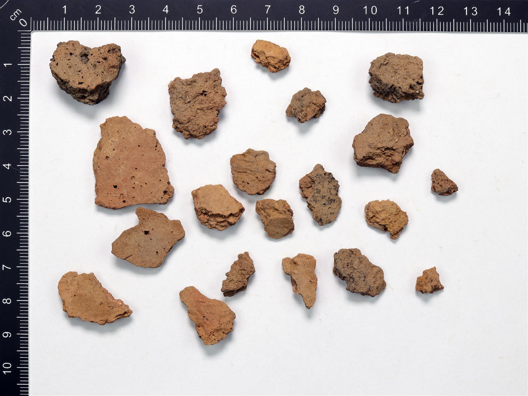 | Koristelemattomia paloja, joista yksi on lohkeamaton. Harmaanruskea savimassa. Sekoitteena orgaanista ainetta ja hiekkaa. Yhden palan sisäpinnalla on hiiltynyttä karstaa. | |