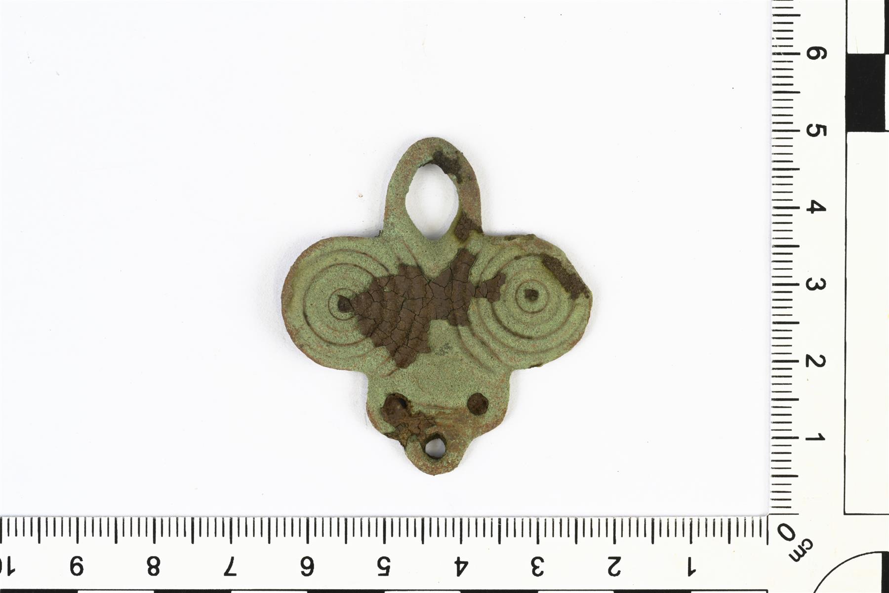 | Kokonaisena säilynyt ketjunkantaja. Sivuilla olevat pyöreät korvakkeet on koristeltu sisäkkäisin kehäuurtein. Vrt. Kivikoski Abb. 767 ja 1110. | |