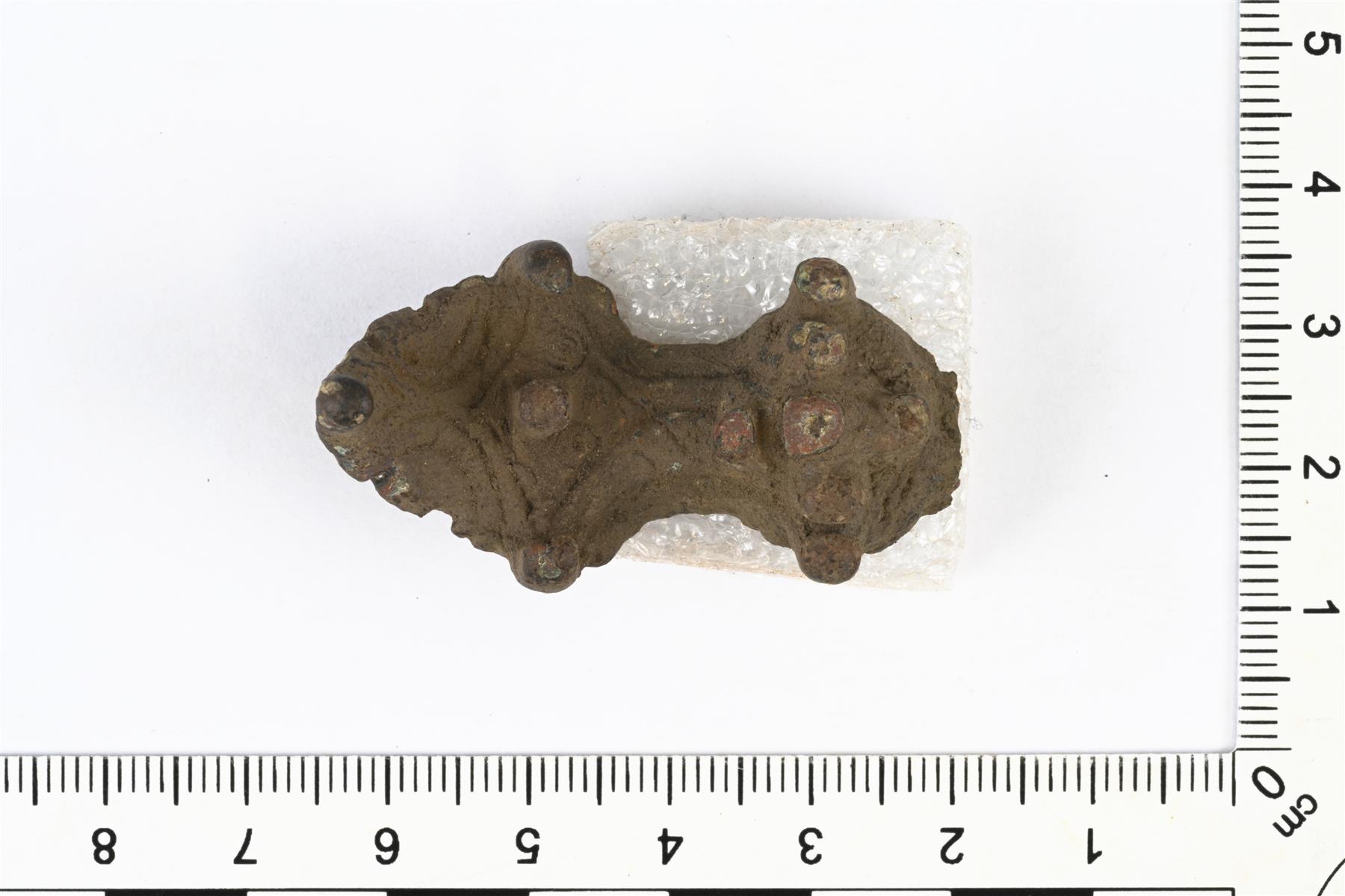 | Tasavartinen solki, toinen pää puuttuu. Koristeluna tappeja ja viivakoristelua. Taustapuolella on neulakota. Kivikosken tyyppiä 7 (Fig. 15). | |