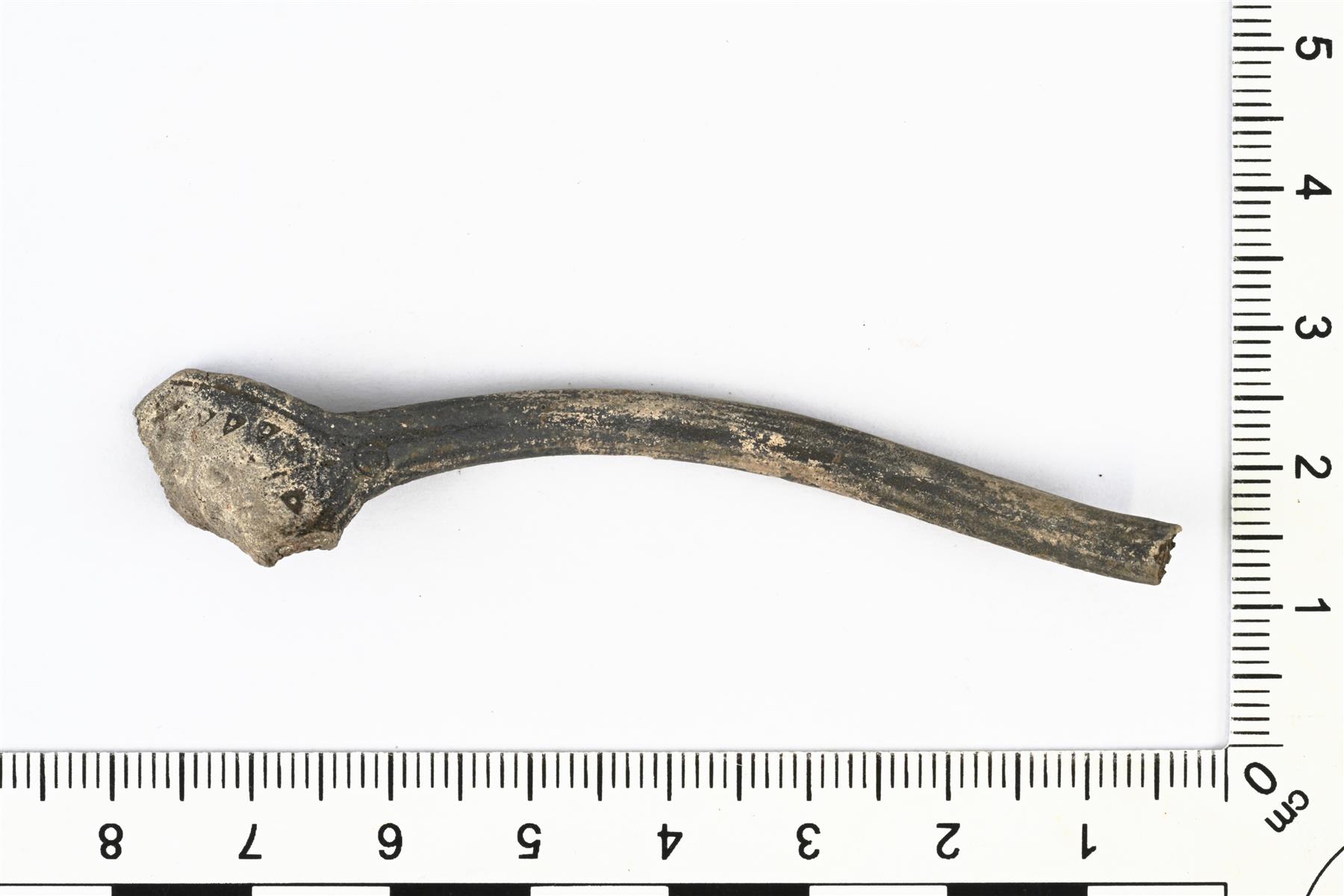 | Hevosenkenkäsoljen neulan katkelma. Kanta on litteä levy, jossa on viivoja sekä kolmio- ja häränsilmäleimoja. | |