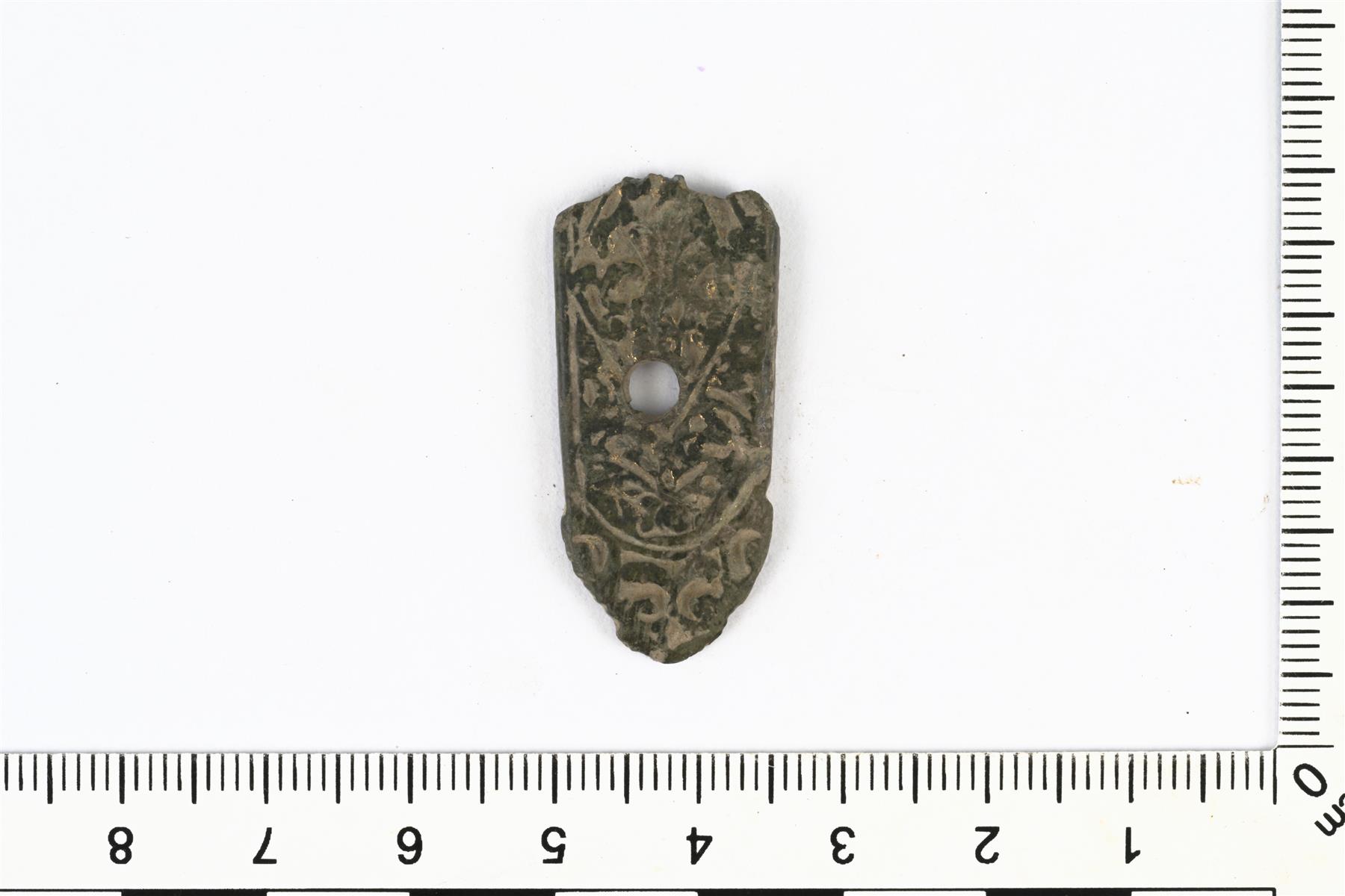 | Kasviornamentiikalla koristeltu hihnan päätehela. | |