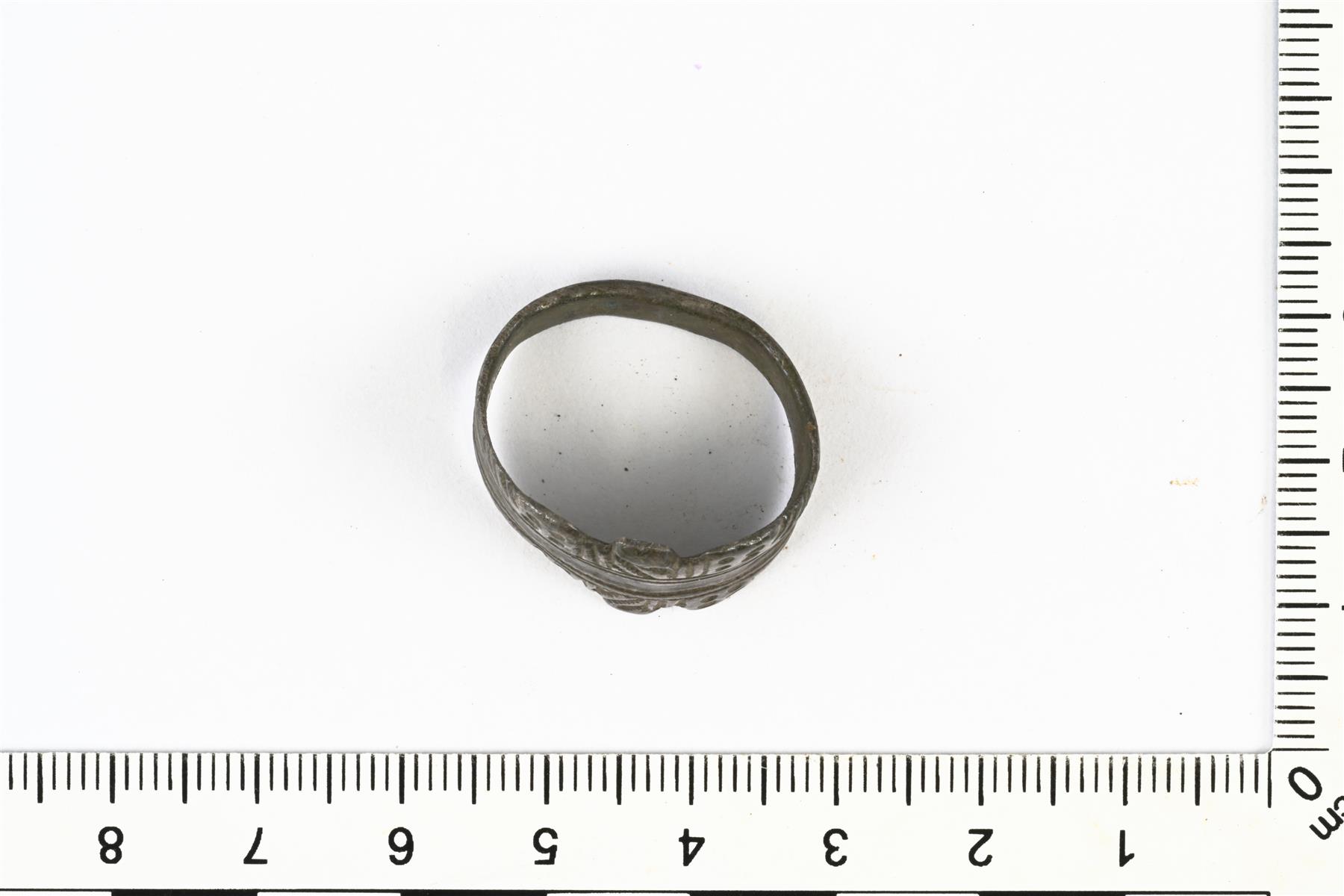 | Hopeinen umpisormus. Etuosa levenee hammastetuksi levyksi, jossa on viivauurteita ja pisteitä. Ks. Lehtinen 379. | |