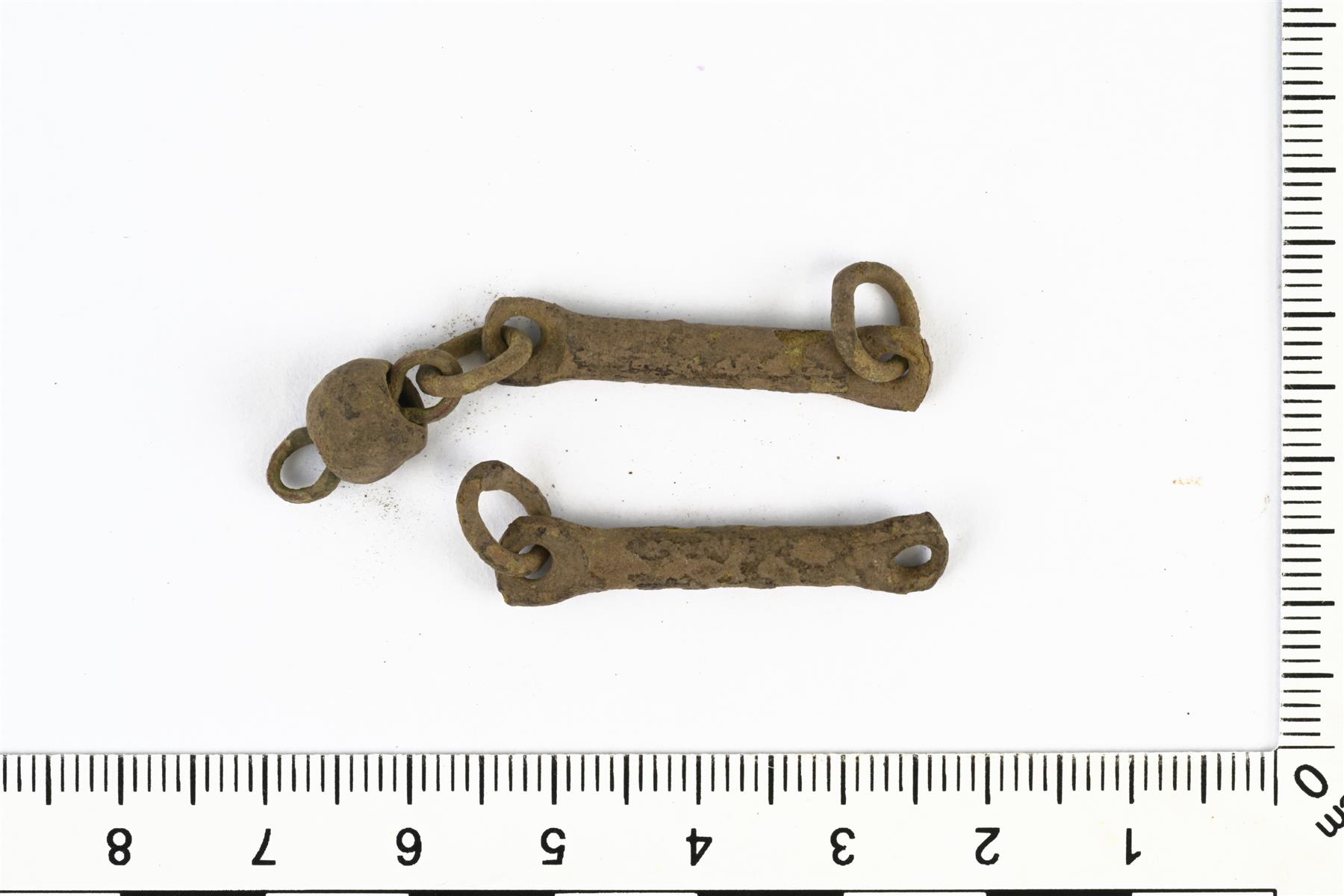 | Kaksi kankiketjun niveltä. Toisessa on kupariseoslenkeillä kiinni pyöreä helmi. | |