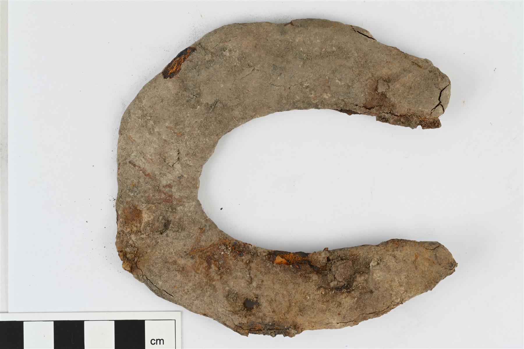 | Hieman aaltoreunainen hevosenkenkä. Luultavasti kuusi naulanreikää, joiden kohdalla kengän ulkoreuna kaartuu hieman ulospäin, naulanreiät yhtä lukuun ottamatta korrodoituneet umpeen. Päissä yksinkertaiset hokit, jotka tehty taivuttamalla kengän pää 90 asteen kulmaan. | |