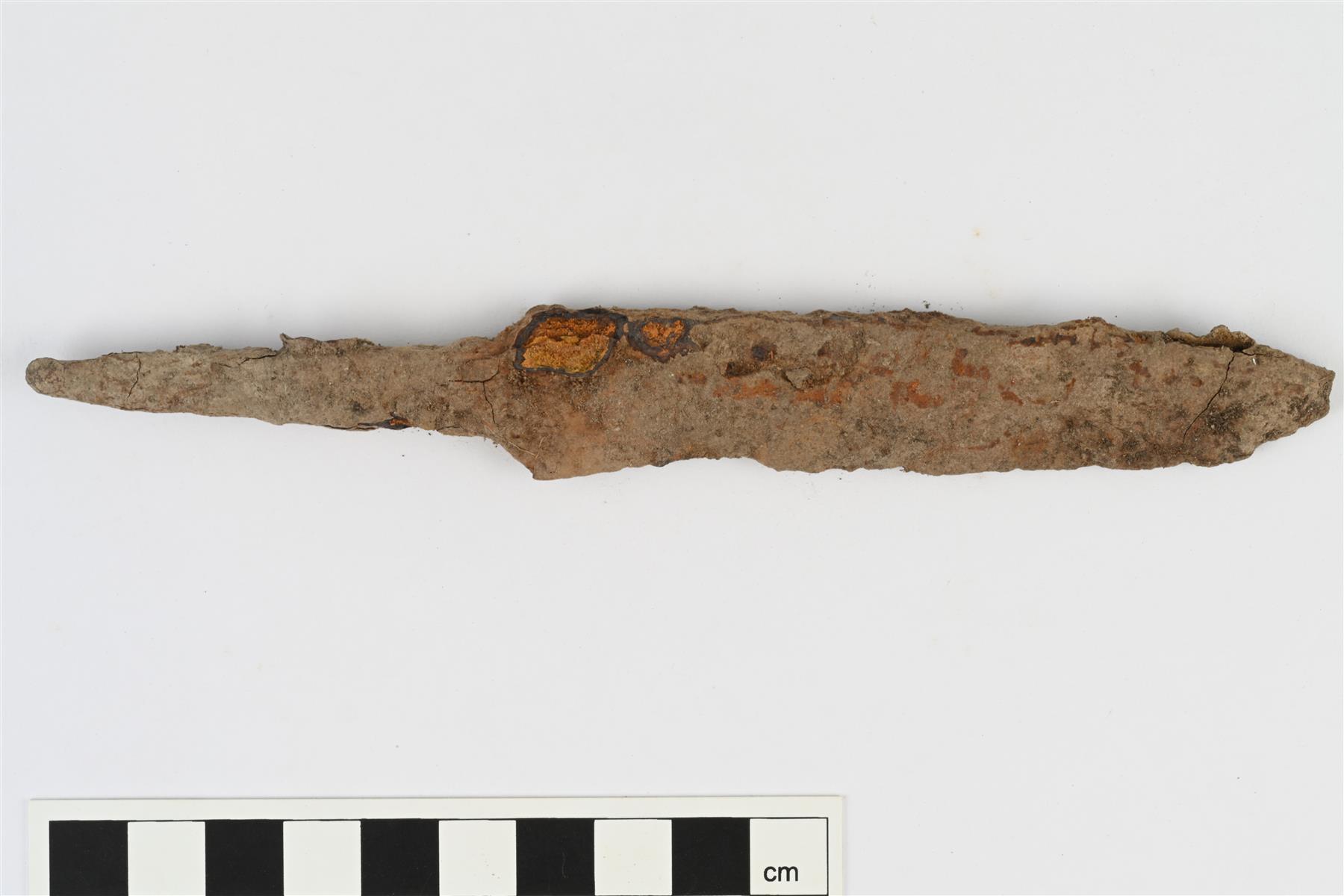 | Ruodollinen veitsen tai puukon terä. Piiloruoto, ruodon ja terän välissä olat. Hamara suora ja kärjestä kupera. Teränsuu ruodon puolelta kovera, keskeltä suora ja kärjestä kupera. Kärki katkennut, teränsuu osittain murtunut. | |