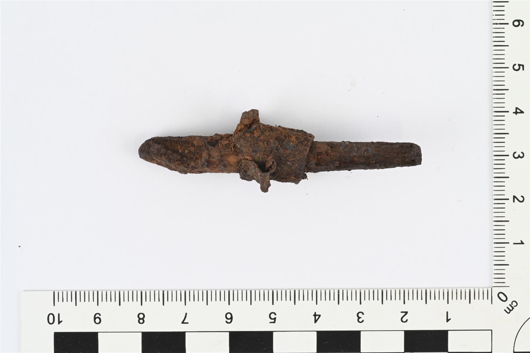 | Rautavartaan katkelma, jonka toinen pää kourumainen. Vartaan keskikohdan ympärillä lyhyt rautaputki, mahdollisesti hela. | |