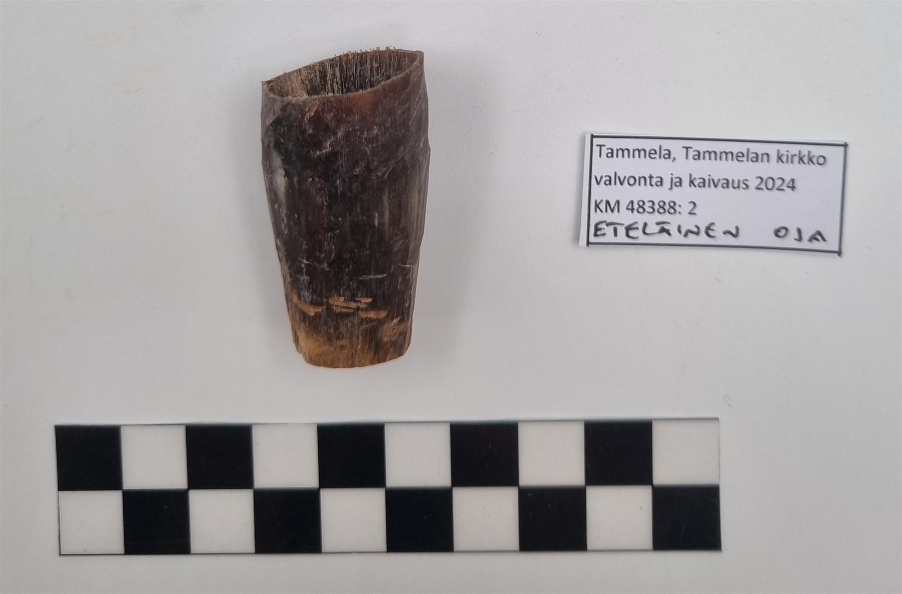 | Hieman epäsymmetrinen lieriömäinen, ontto luuesine. Muistuttaa muodoltaan lähinnä liitupiipun koppaa. Isompi, ovaalinmuotoinen, halkaisijaltaan 16-19 mm aukko yläosassa, alaosassa halkaisijaltaan 6 mm aukko. Kynttilän pidike? | |
