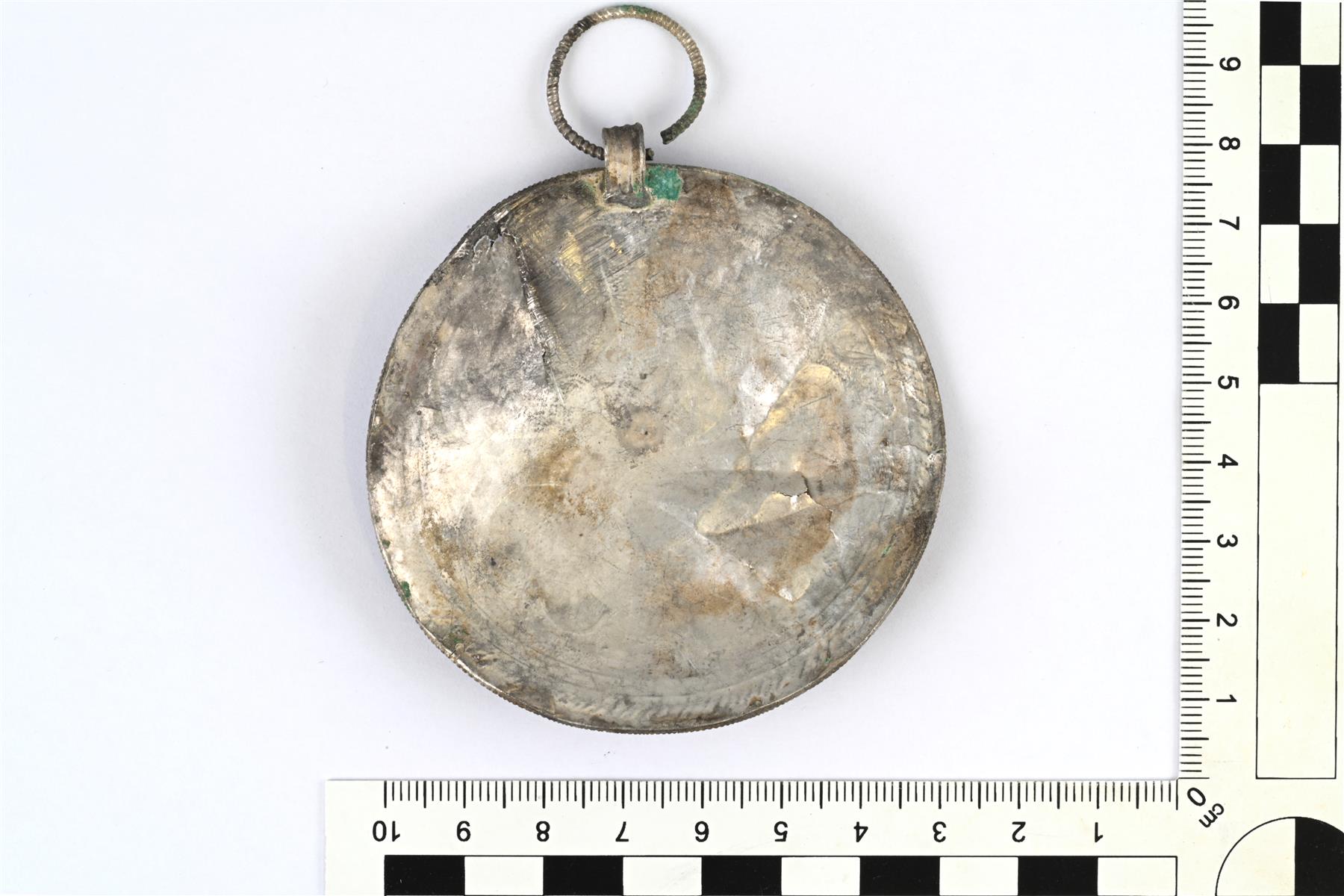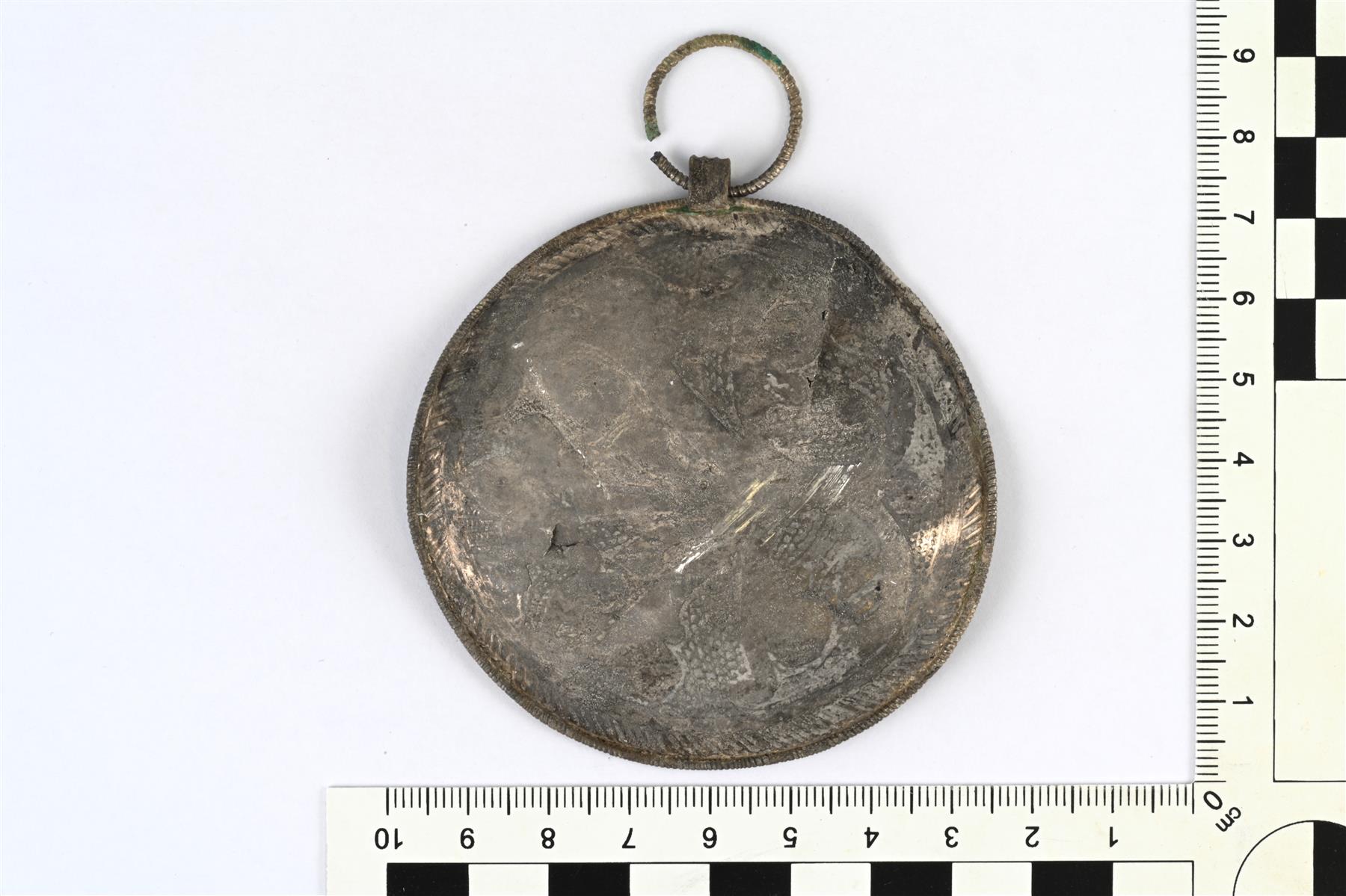 | Osittain rikkoutunut pyöreä levyriipus (ns. levysolki). Koristeluna on kaiverrettua kasviornamentiikkaa. Reunassa on kaiverrettujen vinoviivojen muodostama kenttä. Reunaa kiertää vahvikkeena oleva koristeellinen hopealanka, joka on juotettu kiinni. Ripustuslenkki on juotettu ja siinä on kiinni koristeltu rengas. Vrt. Kivikoski Abb. 1065-1073. | |
