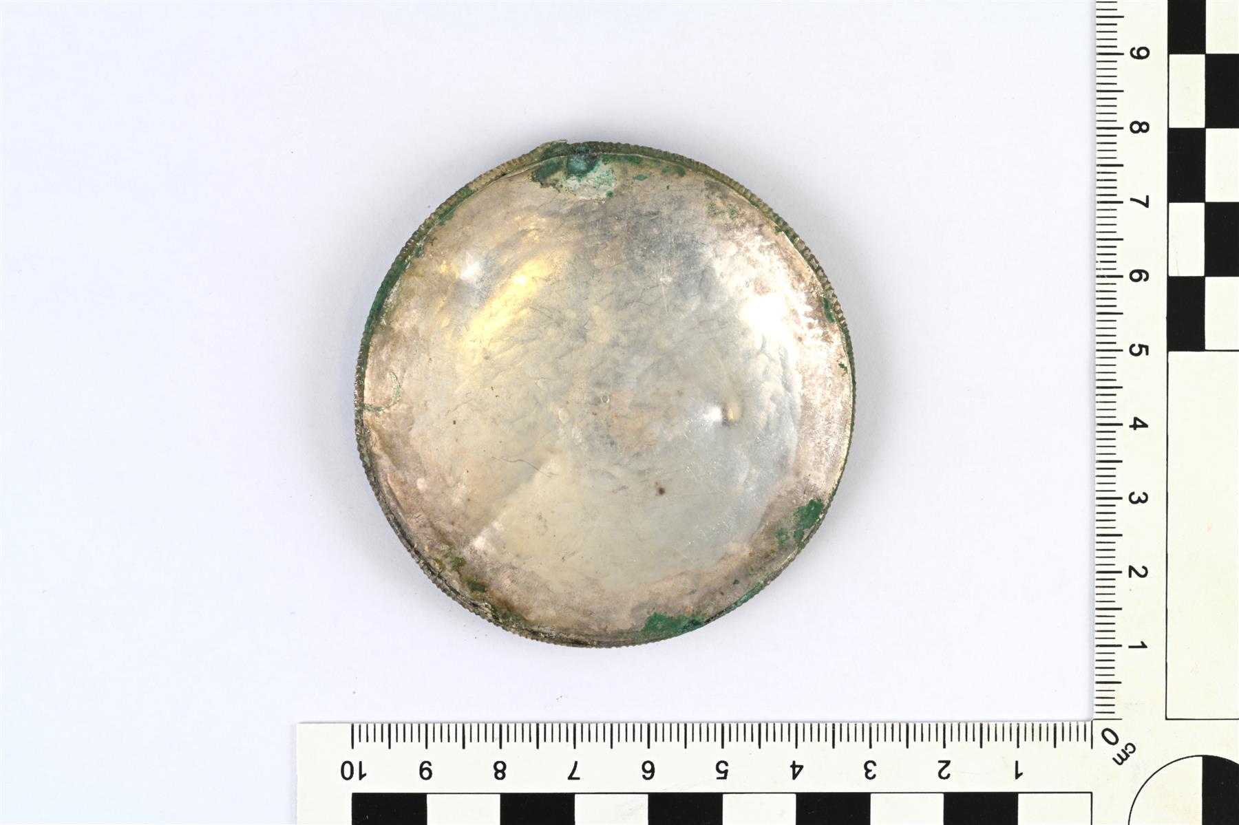 | Pyöreä levyriipus (ns. levysolki), ripustuslenkki on hajonnut. Koristeluna on kaiverrettua kasviornamentiikkaa. Reunassa on kaiverrettujen vinoviivojen muodostama kenttä. Reunaa kiertää vahvikkeena oleva koristeellinen hopealanka, joka on juotettu kiinni. Taustapuolella on havaittavissa selkeitä valmistuksessa syntyneitä vasarajälkiä. Vrt. Kivikoski Abb. 1065-1073. | |