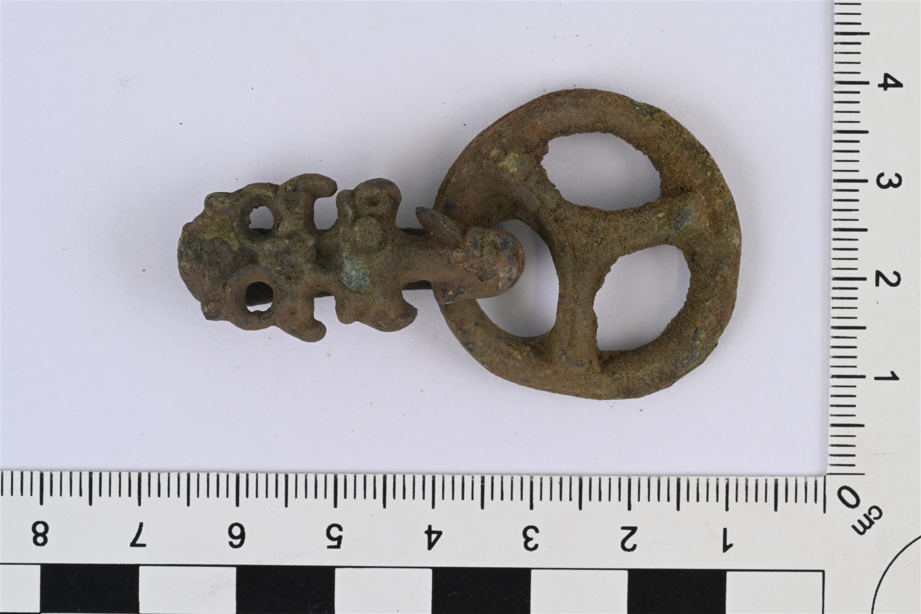 | Hihnanjakajarengas, jossa kiinni yksi eläinpäinen hela. Rengas kolmijakoinen. Hela puhkonainen ja sen kärjessä niitti. | |