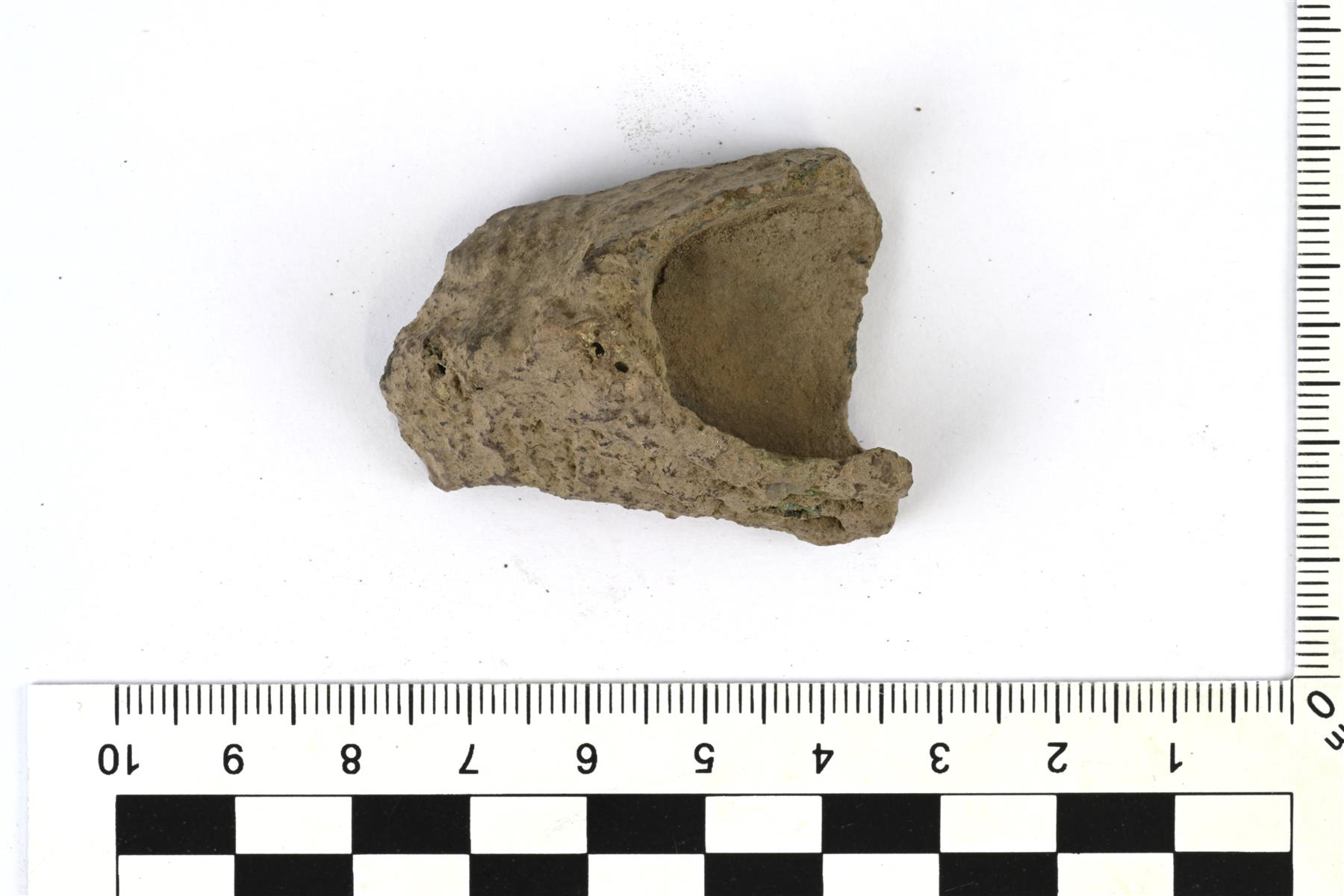 | Enkolpiorannerenkaan etuosan katkelma. Etuosan paksunnos on ontto ja etupuolelta avoin. Koristeluna erottuu viivauurteita ja kohoharja. Vrt. Kivikoski Abb. 752. | |