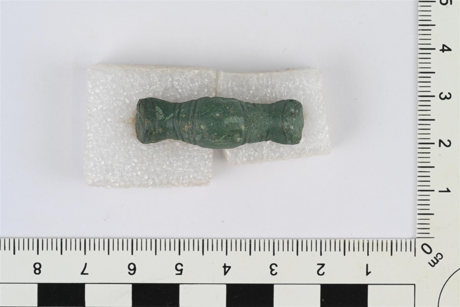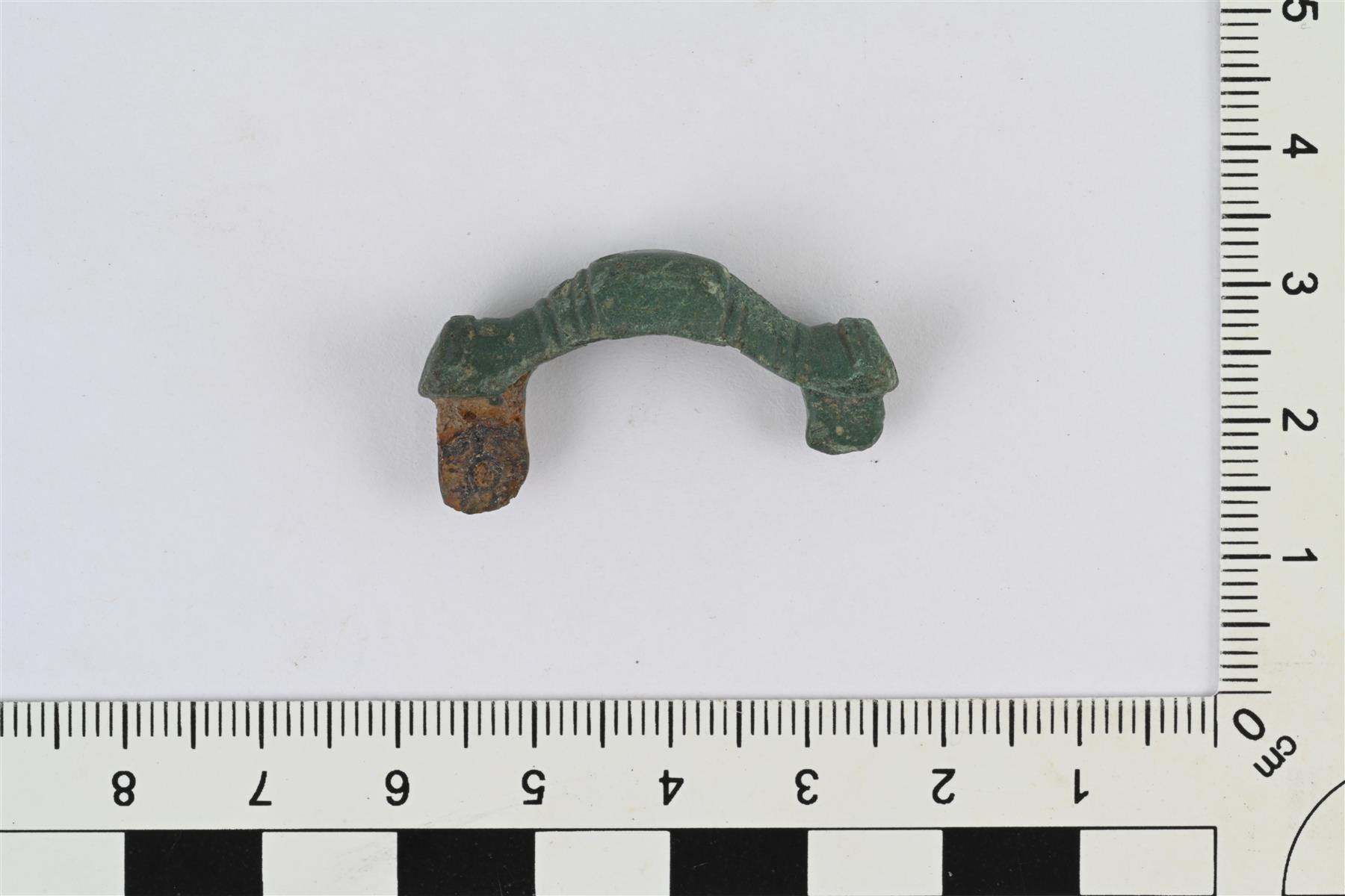 | Tasavartinen solki. Etupuolella poikittaista viivakoristelua. Taustapuolella neulalaitteen jäänteet, neulanpidikkeessä raudan korroosiota ilmeisesti rautaisesta neulasta. | |