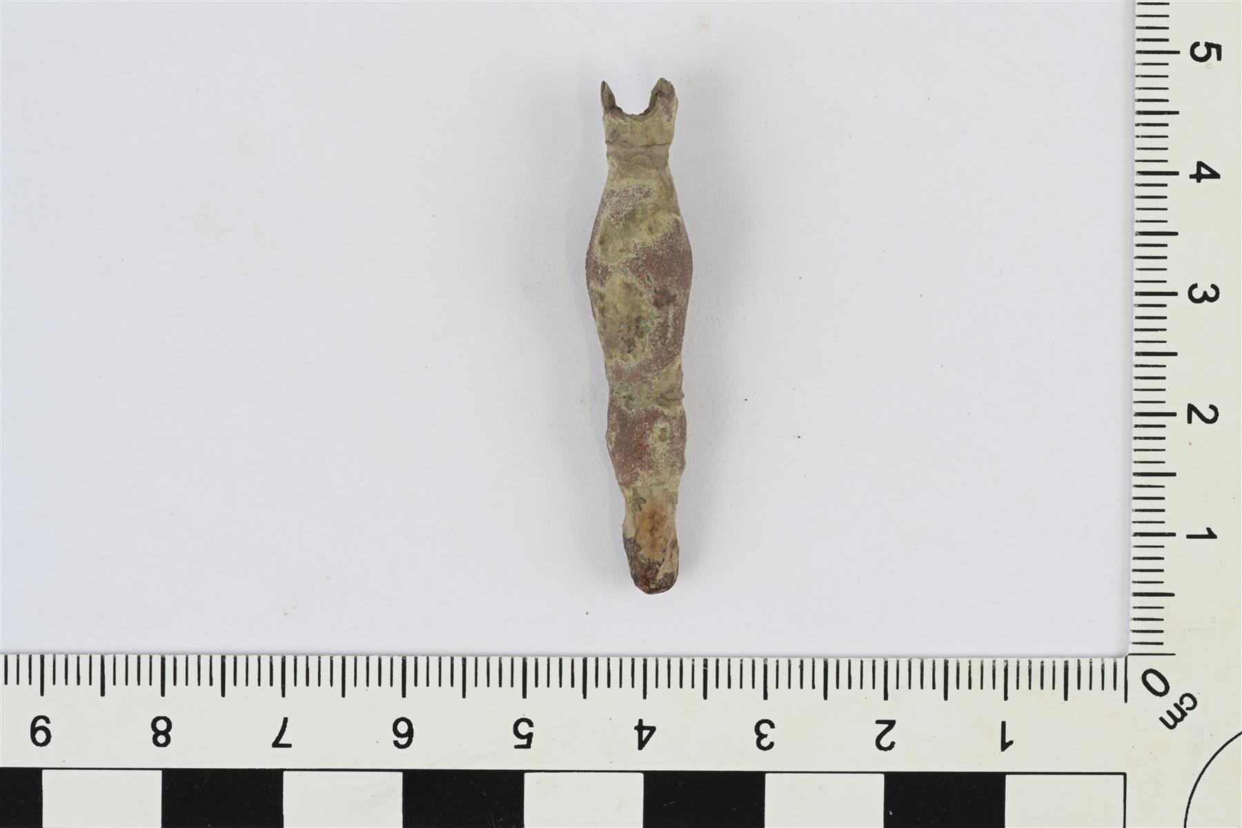 | Koruneulan kanta. Pitkänomainen, poikkileikkaus pyöreä, profiloitu. Toisessa päässä murtunut lenkki, toisesta päästä katkennut neula. | |
