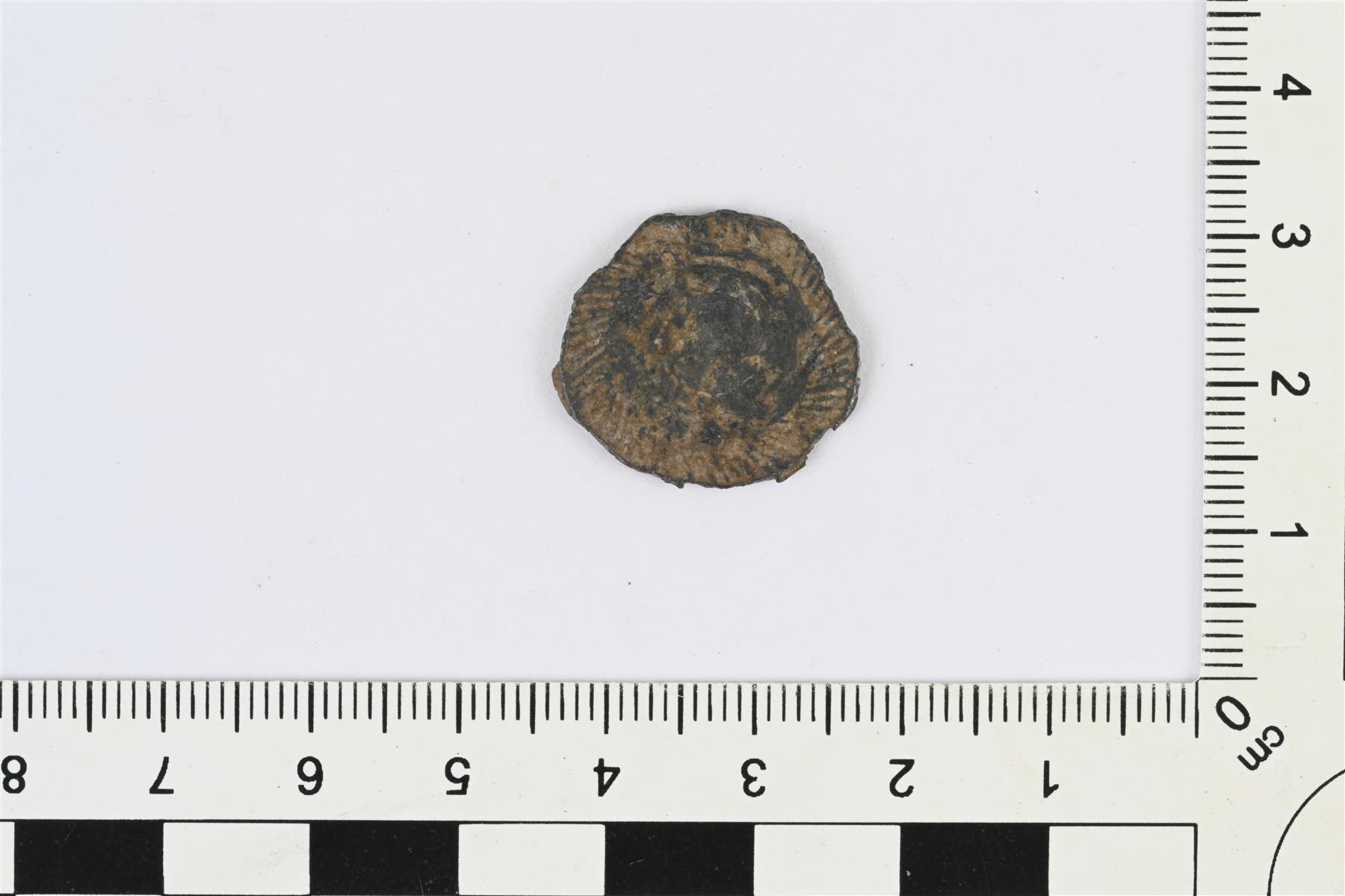 | Hela tai nappi. Pyöreähkö, reunat murtuneet. Etupuolella koristeluna sisäkkäisiä kehiä ja reunassa pienistä vinoviivoista koostuva koristeraita. Taustapuolelta katkennut kiinnitin. | |