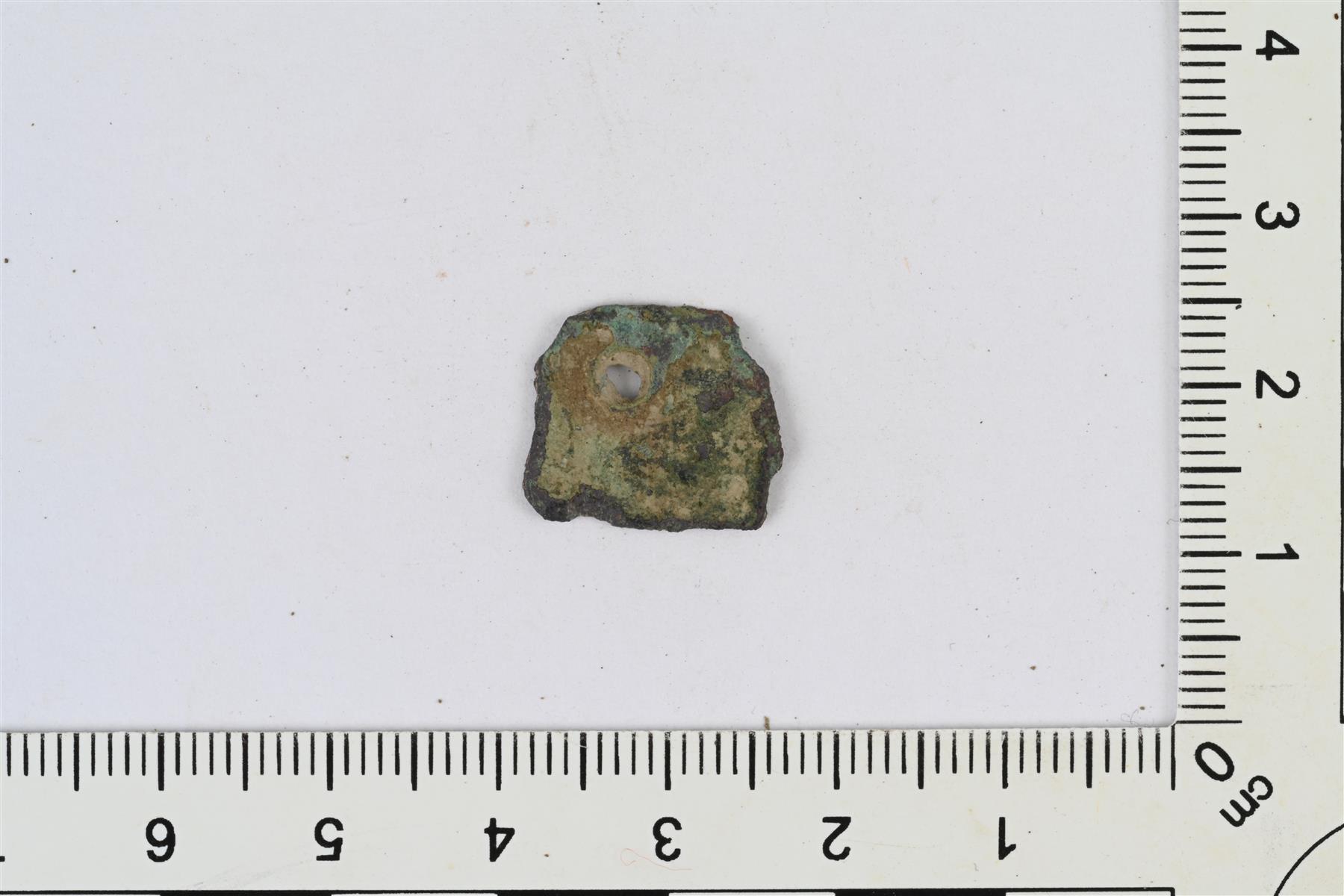 | Helan tms. katkelma. Kulmikas kupariseoslevyn pala, jossa pyöreä reikä. Reunat osittain murtuneet. | |