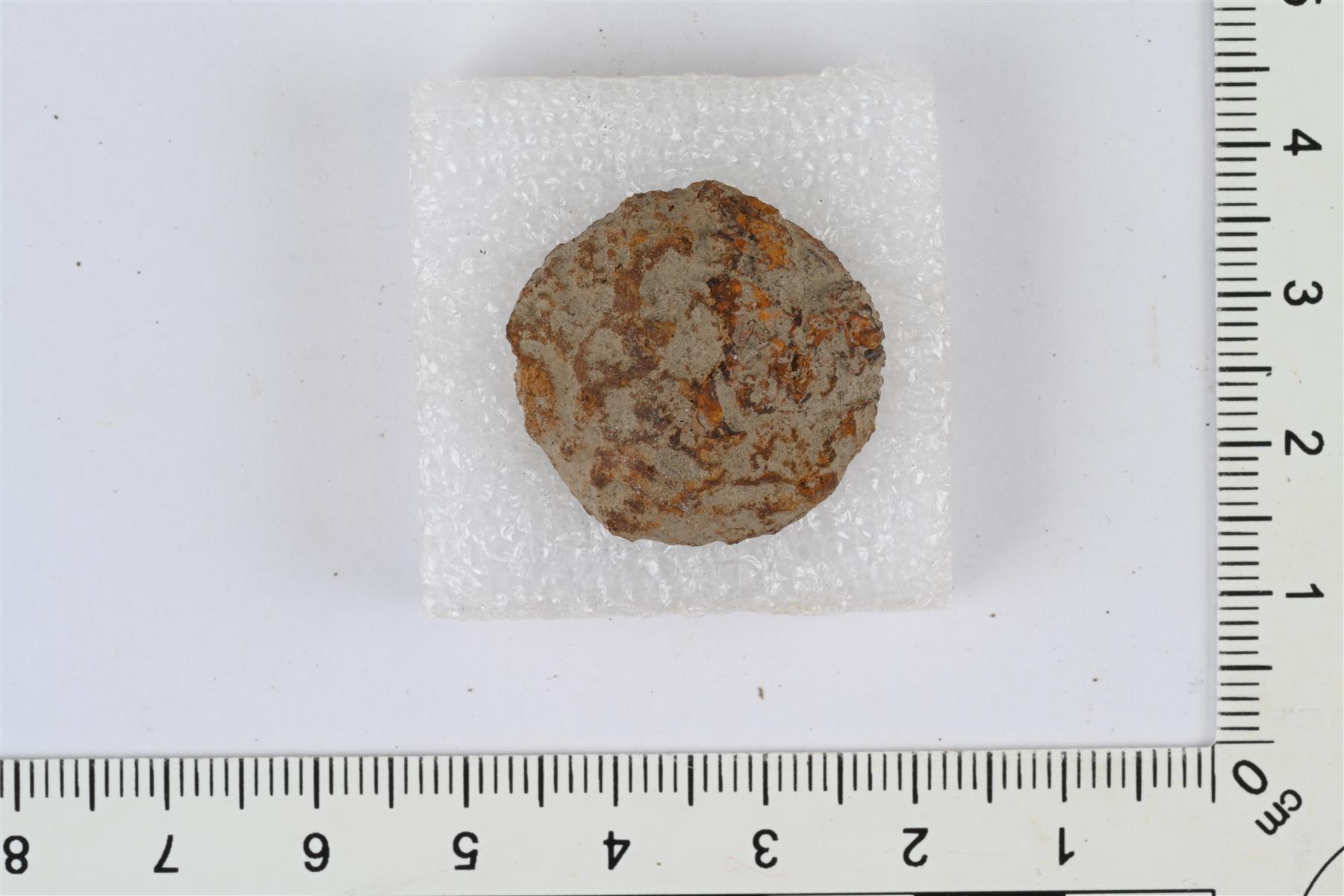 | Nappi, jonka etupuoli rautaa ja tausta kupariseosta. Taustapuolella kanta. | |