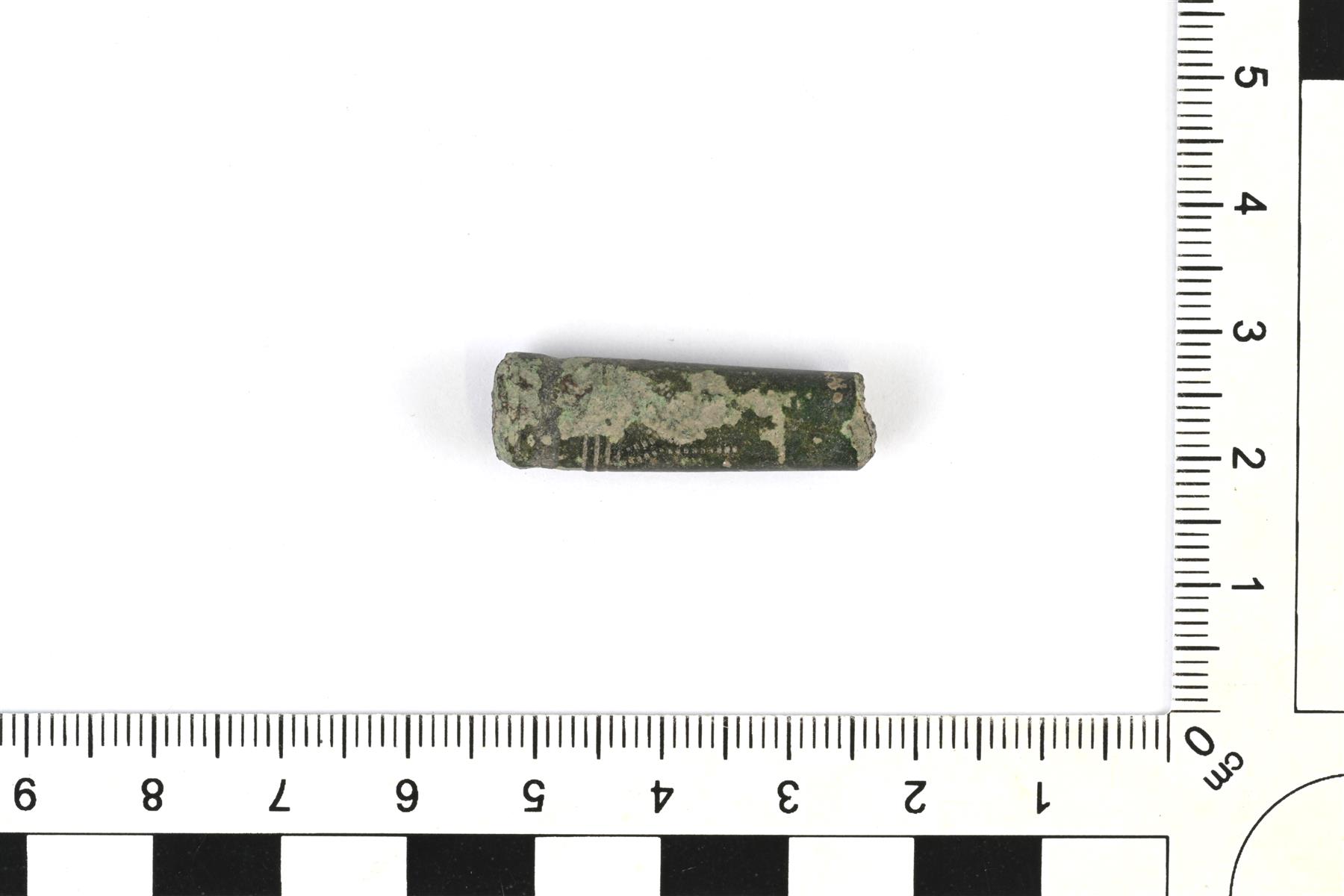 | Poikkileikkaukseltaan ovaalin kaularenkaan katkelma. Koristeluna viivauurteita ja pisteviivoja. | |