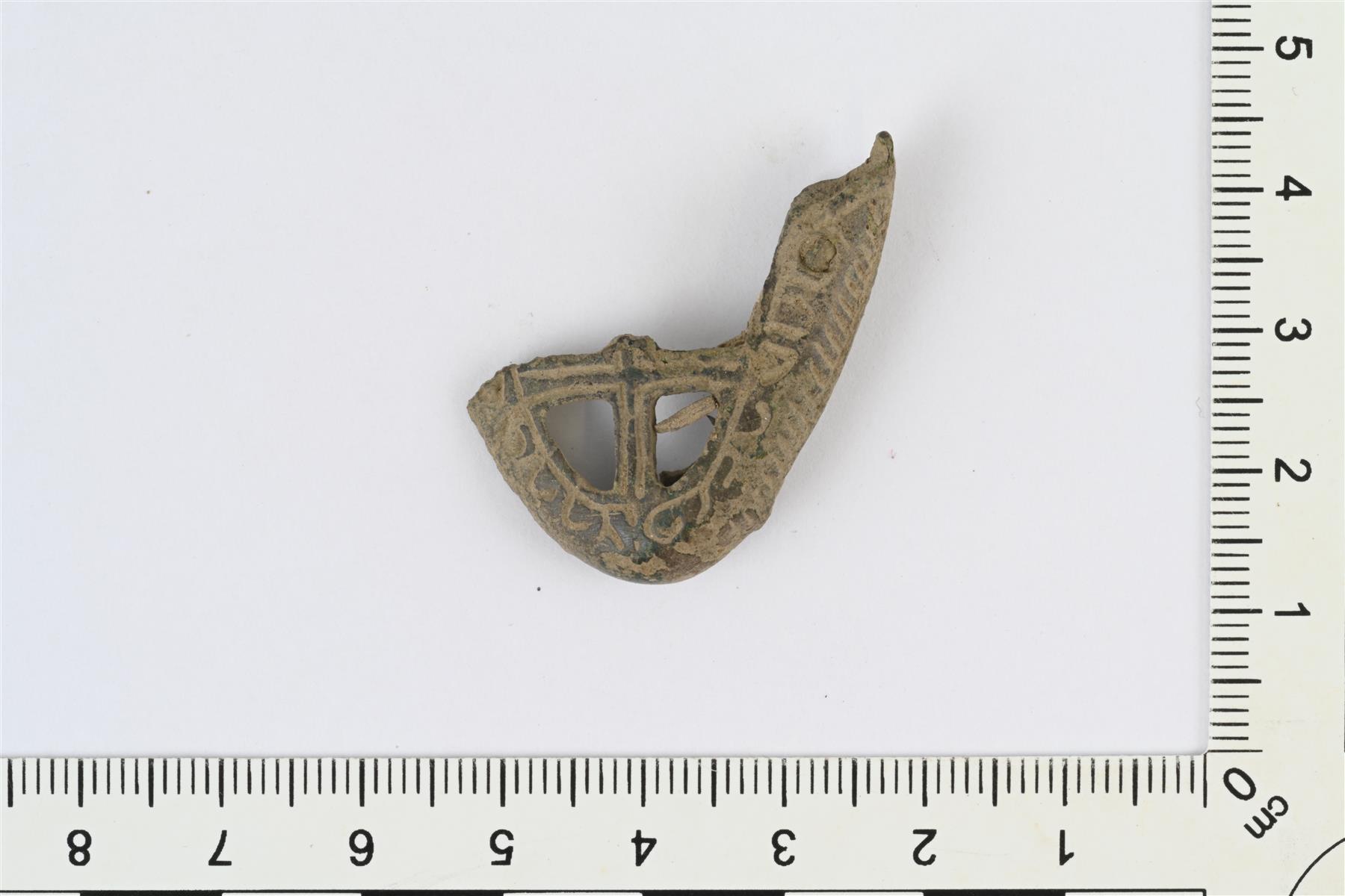 | Katkelmallinen huotran kenkäin. Melko matala. Koristeltu reunus, jonka sisällä puhkonainen kuvio, mahdollisesti tasavartinen risti. | |