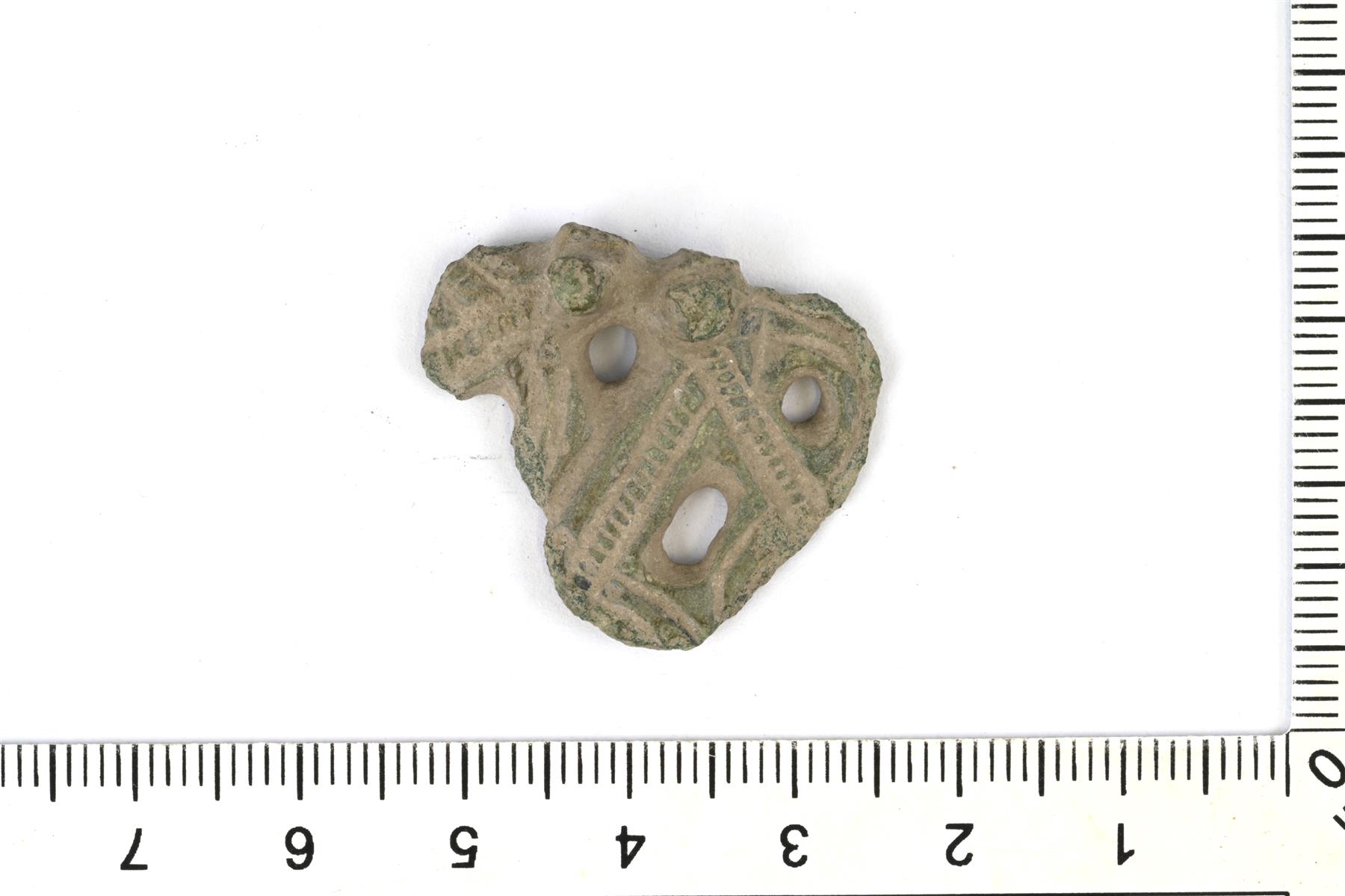 | Pyöreän kupurasoljen katkelma. Koristeluna viivauurteita, helmiviivoja, tappeja sekä reikäkuvioita. | |