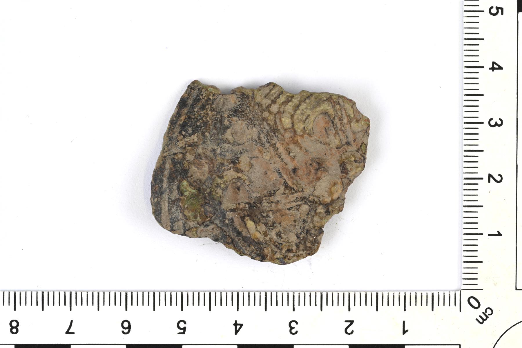 | C-tyypin pyöreän kupurasoljen katkelma. Osittain sulanut. Taustapuolella on säilyneenä neulakodan jäänne. | |