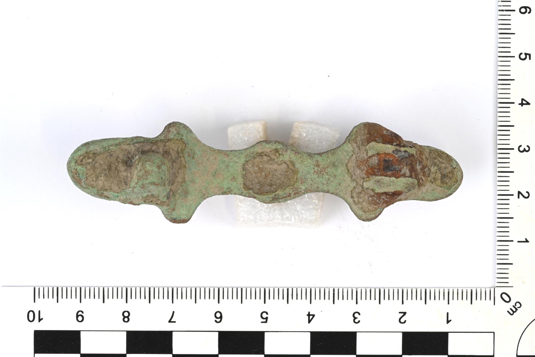| Tyypin 8 tasavarsisolki. Pinta on pahoin kulunut. Taustapuolella on neulakota ja kaksi neulan kiinnityslenkkiä. Näiden välissä on rautaneulan jäänteitä. Vrt. Kivikoski Fig. 22. | |